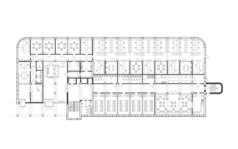 Die typologisch störenden und strukturfremden Einbauten, welche sich über die Jahre auf allen Geschossen verdichtet haben, soll bis auf das ursprüngliche Tragwerk zurückgebaut werden. Dadurch wird die ursprünglich räumliche Klarheit wiedergewonnen, in deren Verständnis weiter gebaut werden kann. Eine wesentliche Rolle kommt dem expressiven Betonskelett zu, das in seiner Dominanz kaum zu verstecken ist. Scheinbar selbstverständlich wird der Weg zu den Grossräumen aufgezeigt, die durch die querlaufenden Unterzüge in Abschnitte gegliedert sind. Ausgangspunkt ist geschossweise eine klar definierte Treppenhalle, aus der man die Grossräume betreten kann. Diese soll in seiner vollständigen Dimension wieder hergestellt werden.