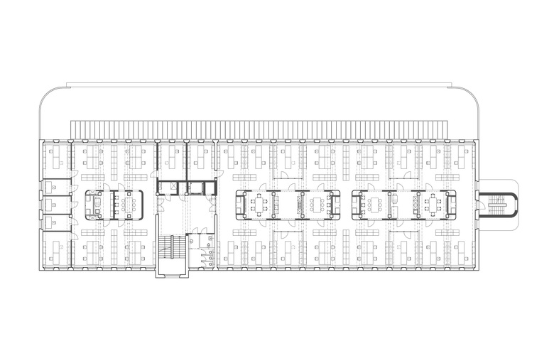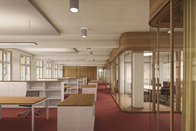 In den zentral gelegenen und transparent ausgebildeten Sitzungszimmern können nicht nur formelle Sitzungen abgehalten werden, sondern auch bilaterale Gespräche in Arbeitsgruppen geführt, oder täglich Kaffee getrunken werden. Dafür sind die Räume mit textilen Vorhängen ausgestattet, dass der Grad an Diskretion variiert werden kann. Diese konzentrierten Bereiche lassen dennoch immer wieder Durchblicke zwischen den Raumseiten zu. So ist sichergestellt, dass die Arbeitsplätze konsequent entlang den gut belichteten Aussenwänden in unterschiedlich grossen Kojen aufgereiht werden können. Die Grössen dieser Kojen können durch die Lage der Einzelbüros nach Bedürfnissen der verschiedenen Arbeitsgruppen variiert werden. Überschaubare Kojen für Praktikanten oder für Reservearbeitsplätze lassen sich so entsprechend den Anforderungen der verschiedenen Abteilungen ausbilden. Hierfür sind die Einzelbüros – in denen auch Doppelarbeitsplätze platz finden – in einer Leichtbauweise deckungsgleich unter die Unterzüge gestellt, so dass die Arbeitsbereiche zueinander kongruent bleiben. So ist eine Büro- und Verwaltungs-