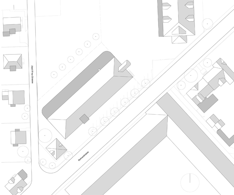 Der Entscheid, die bestehende Fluchttreppe durch einen Treppenanbau zu ersetzen resultiert aus der Überzeugung, dass sich an dieser Stelle ein Gebäudeteil in der vorgeschlagenen Form der Gesamtgestalt des Zeughauses in entsprechender Weise einordnen kann. Gegenüber dem Turm des Haupttreppenhauses an der repräsentativen Südfassade tritt der Treppenanbau weit zurückversetzt kaum in Erscheinung, liegt er doch in der Fortsetzung der Längsachse. Die Ausbildung der Dachkante ist soweit reduziert, dass das abstraktere Volumen nicht mit dem auskragenden Vordach des Gebäudes in Konkurrenz tritt.