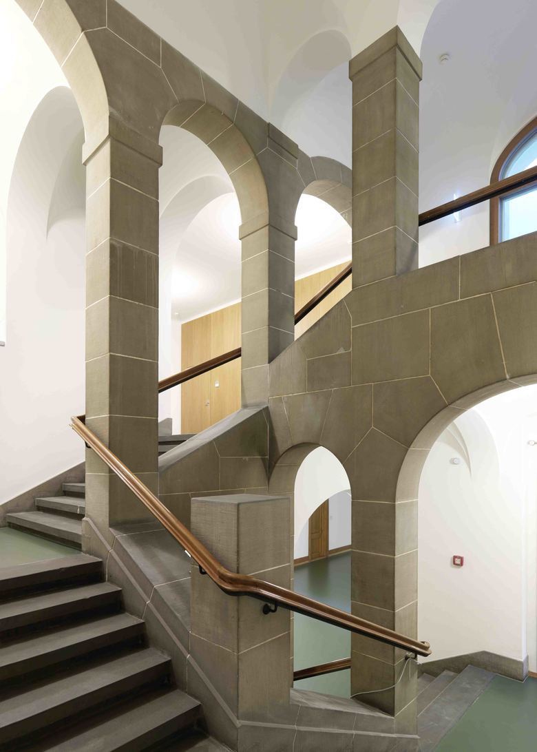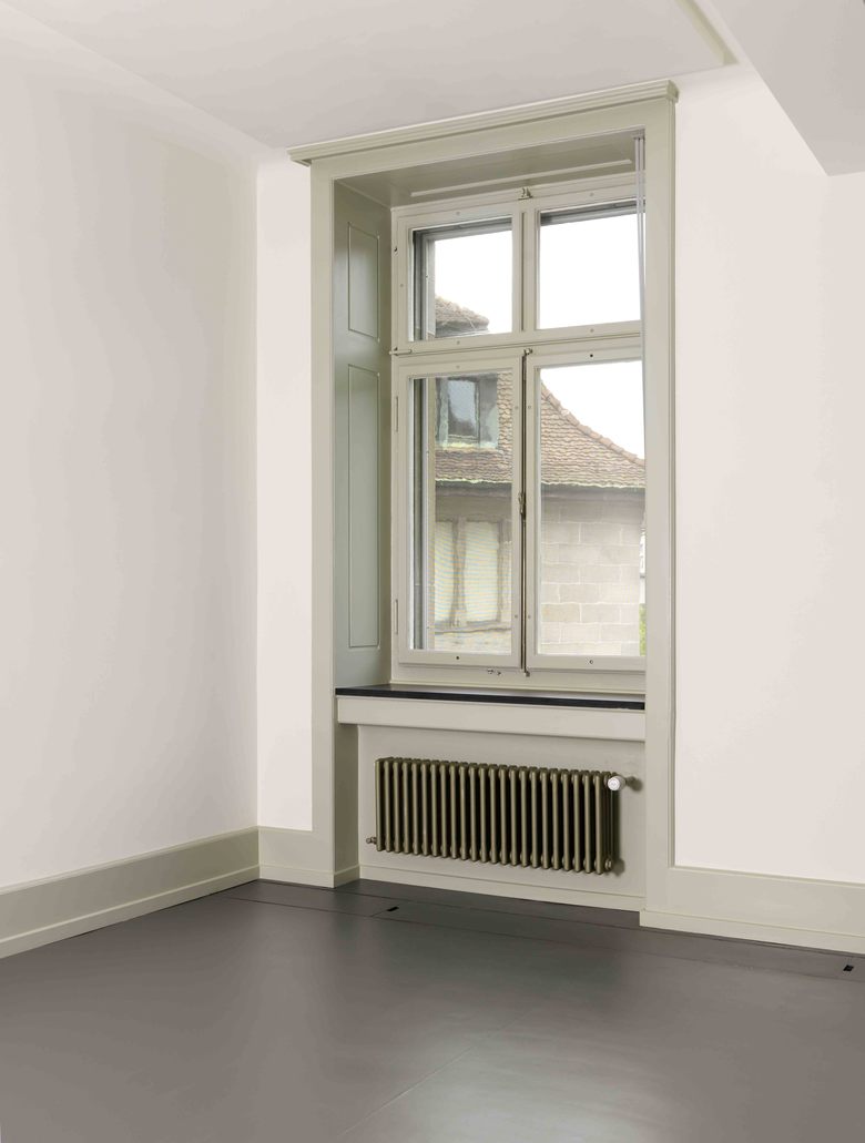 Im Rahmen einer Gesamtkonzeptstudie zum Umbau des Amtshauses I, sind in einem ersten Teilprojekt die Regelgeschosse im Sinne einer Interpretation der ehemaligen „Gewände“ entstanden. Zusammen mit den noch vorhandenen Gull‘schen Bauteilen und deren Materialisierung wurde basierend auf der intensiven Recherche eine angemessene Raumfassung zu einer pragmatischen Interpretation geführt. Die Interpretation nicht mehr vorhandener reichhaltiger Fenstergewände und Holzwerk, unterschiedlicher Wandtäfelungen sowie Bodenbeläge und Stuckdecken, erfolgte in einer reversiblen Überfassung der Haupträume mit robusten Materialien, kräftigen Farben und Kontrasten. Durch die Wahl von „zeit-verwandten“ Materialien und Farben, wie sie auch 1914 zur Anwendung hätten kommen können, wurde die Kohärenz hinsichtlich architektonischer Gestaltung gestärkt.