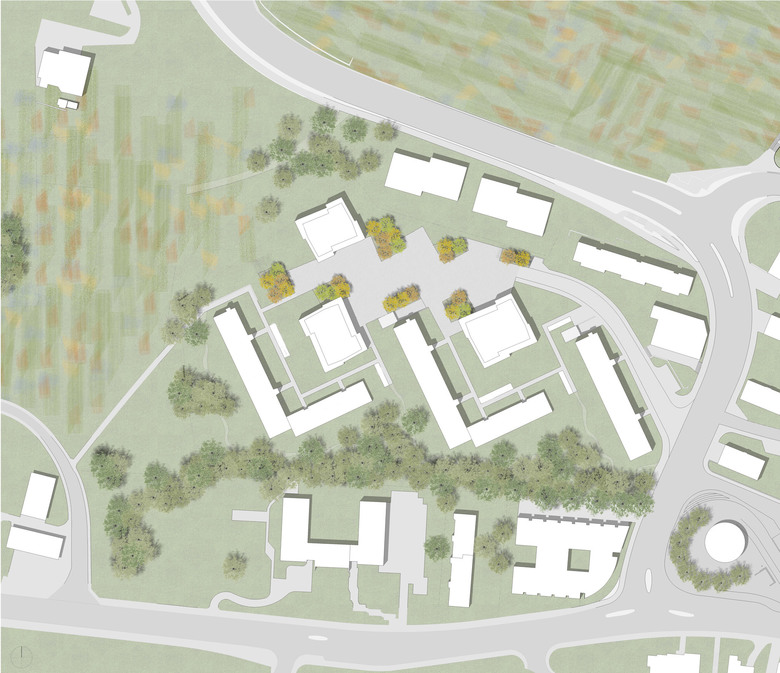 Ohne die schlüssig situierten Wohnscheiben in Frage zu stellen, werden drei neue, punktförmige Bauten gesetzt. Die beiden vorderen Häuser besetzten die Zwischenräume so, dass ein ausreichender Abstand zu den umliegenden Bauten entsteht und für die hangseitigen Nachbarn der Talblick offen bleibt. Der dritte Baukörper ist in den Hangfuss gesetzt und lässt, von Grünfächen umschlossen, den Blick auf den Rebhügel offen. Die Neubauten sind ihrem direkten Umfeld entsprechend dimensioniert und bilden durch ihre leicht variiert Ausformulierung ein eigenständiges Ensemble das den neuen Siedlungsschwerpunkt generiert. Die Konrad-Ilg-Strasse wandelt sich zu einer offenen und freien Platzfigur die sich zwischen den Gebäuden aufspannt. Sie dient der gesamten Siedlung als grosszügige Spielfläche, als Begegnungs- und Aufenthaltsort, welcher die Bezüge der Gebäude untereinander unterstreicht. Die bestehenden Bauten werden integriert, deren übersichtliche Adressbildung bleibt erhalten.