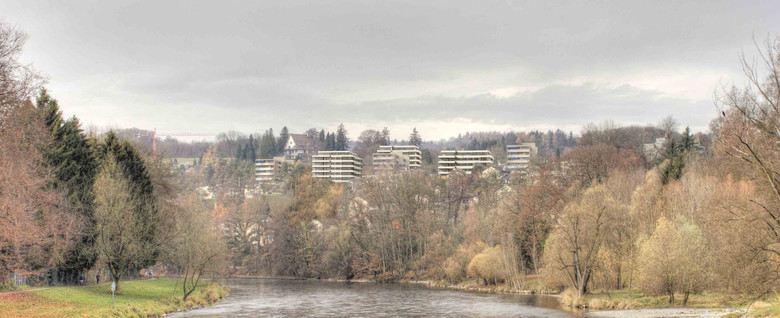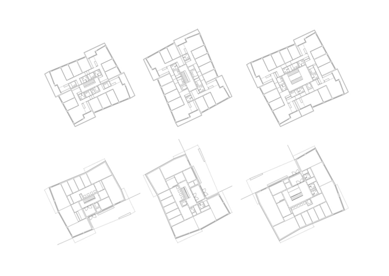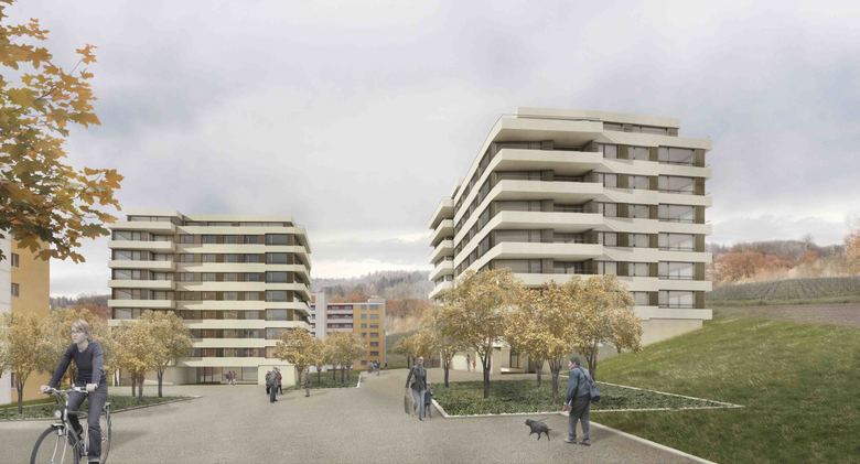 Alle drei Gebäude sind als Mehrspänner rationell organisiert und stellen damit eine adäquate Reaktion des formulierten Zieles dar, kostengünstigen Wohnungsbau zu realisieren. Sämtliche Wohnungen sind zweiseitig orientiert und profitieren somit vom Ausblick ins Limmattal aber ebenso hangseits in den grosszügigen zusammenhängenden Freiraum. Die städtebauliche Vorstellung, einen möglichst geringen „Fussabdruck“ zu hinterlassen, führt im Grundriss zu einer kompakten und damit rationellen Konzeption. Dem „Zwiebelschalenprinzip“ folgend, wird der Abfolge von innerem Treppenkern, dienenden Räumen, Wohn-/ und Schlafräume bis zur Fassade auch in der konstruktiven Ausbildung Rechnung getragen.
