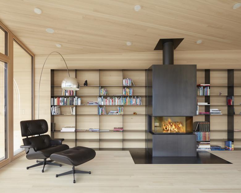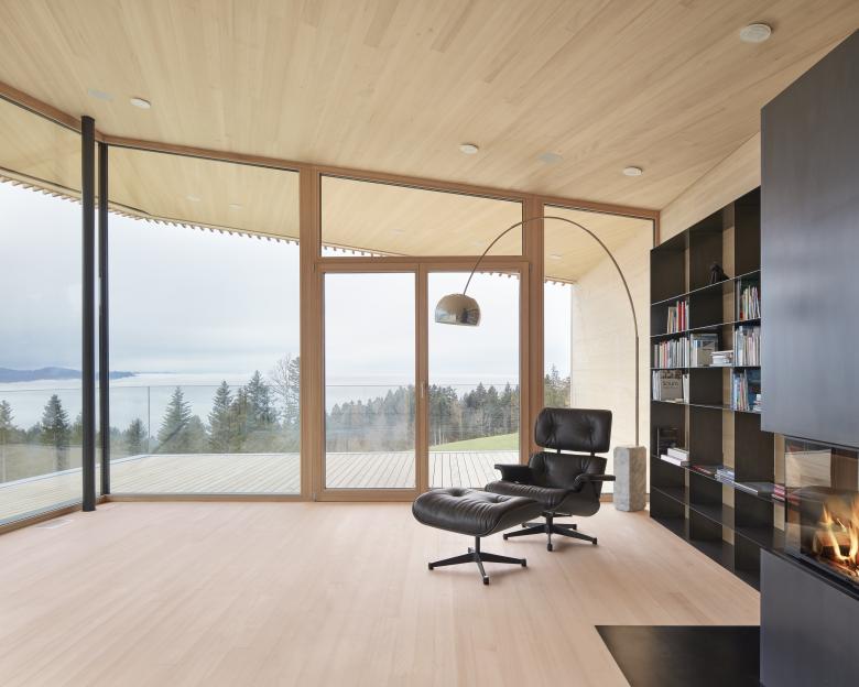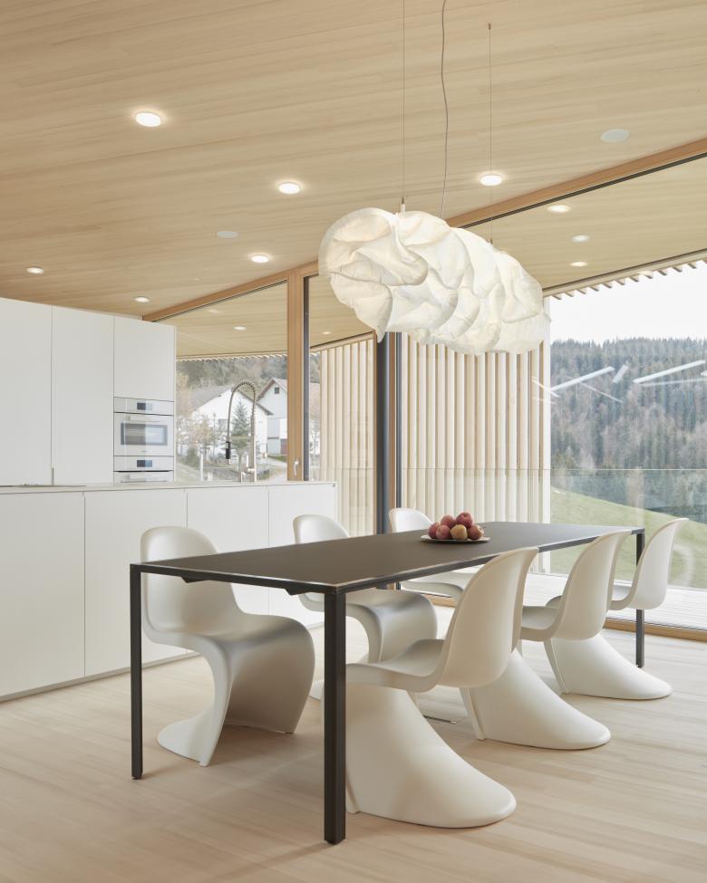 Ein atemberaubender Ausblick auf den Bodensee und die Berglandschaft, dazu ein dreiecksförmiger Grundstückszuschnitt in Hanglage – das waren die Gegebenheiten, die Berktold Weber Architekten aus Dornbirn für die Planung dieses Einfamilienhauses am Rande eines kleinen Dorfes vorfanden. Daraus entstanden ist eine klare, nachhaltige Architektur. „Das Haus ist auf beiden Ebenen erschlossen, in Hinblick auf eine spätere Nachverdichtung ist eine Teilung in zwei Einheiten möglich“, erklärt Architektin Helena Weber. Positioniert wurde der moderne, detailgenau vorgefertigte Holzbau mit seiner eher geschlossenen, rückwärtigen Seite zum Berg. Nach vorne, zum Dorf hin, öffnet er sich mit einer großzügigen Glasfassade. Das Haus vereint dabei modernste und energieeffiziente Haustechnik mit dem Einsatz regionaler Materialien wie geseifter Weißtanne oder Schwarzachtobler Naturstein. Betonelemente sowie vorwiegend in Weiß und Schwarz gehaltene Innenausbauelemente ergänzen das harmonische Zusammenspiel der Materialien und geben den Räumen ein ruhiges, im besten Sinne zurückhaltendes Erscheinungsbild. Innen und außen passten insgesamt 74 in das BUS-System des Hauses integrierte Nimbus Modul R 36-Leuchten perfekt zur Gesamtästhetik. Architekten, Fachplaner und Bauherren entschieden sich für die Leuchten wegen ihres „dezenten Erscheinungsbildes, ihrer guten technischen Qualitäten, dem durchgängigen Design und der flexiblen Einsatzmöglichkeiten“.
