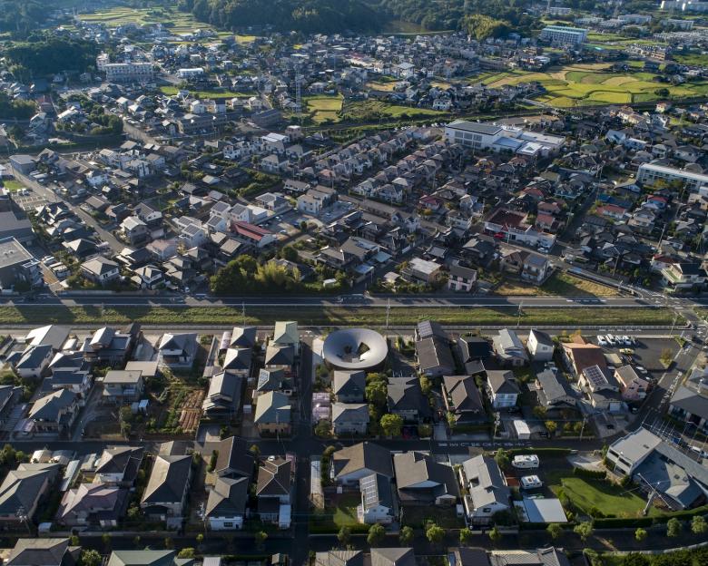 A large, vessel-shaped tile roof was placed on top of the distorted circular floor plan perimeter wall. The roof blocks the view from the surroundings while bringing the sky into the interior. The perimeter wall has a green garden on its outer edge since the site is large enough to accommodate it. The openings in the perimeter wall are minimal, consisting of high sidelights and ventilation windows, while the interior plaster walls gently curve to serve as a backdrop for paintings and other decorations.