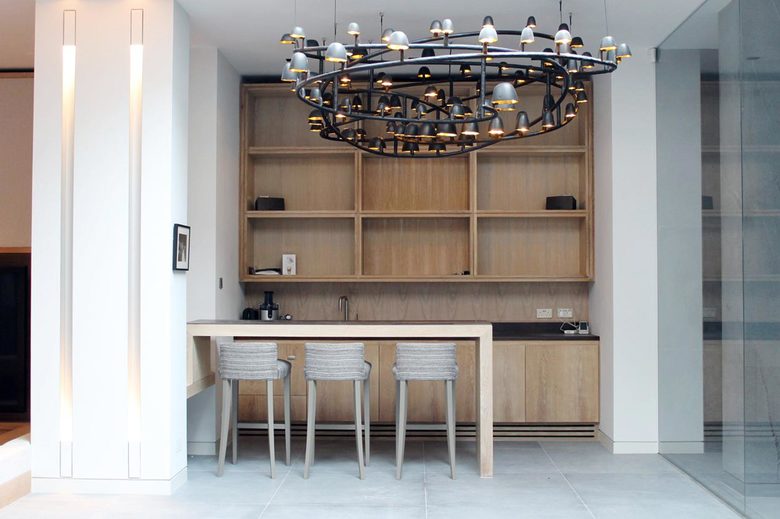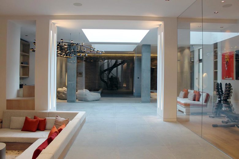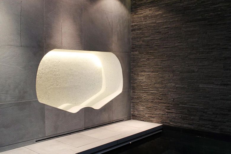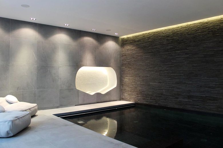 A luxury private spa in a subterranean space; carved out from beneath an existing house in central London. Working in partnership with HAKA Designs, the spa features a wooden spiral staircase within a light well which sweeps from the house above into the spa, with a direct visual connection to the pool at the opposite end. Natural light filters through from a central skylight. To both sides of a central space are a bar, a sunken lounge, a gym with change areas, and rain showers. Beyond this is the vitality pool; a calm meditative space behind a glass wall, clad in grey limestone with an illuminated textured stone wall on one end. A relaxing vitality bed is set into the stone wall.