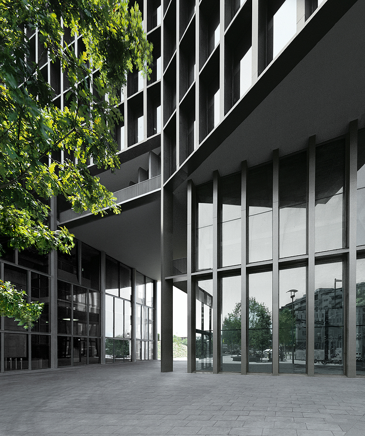The framework, painted a steely bronze color, just like the fine metal frames of the windows that close off the recesses of the structure, nuances the different spans, giving the tower a sensitive, powerful look. With its huge segmented glass panes, the front wall of the plinth forms an urban façade and, thanks to its transparency, allows the life of the building and the movements of the public to be seen.