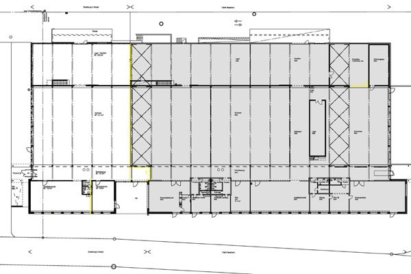 Die vier parallel nebeneinander liegenden, verschieden hohen Baukörpern mit zugeordneten Nutzungen wie Produktion (Spritzerei), Lager und Versand, Büro- und Personalräumen und interner Verbindungsstrasse, werden nach Westen um 6 Achsen á 5m erweitert.