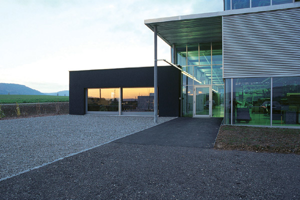 Produktion mit bläulichem Glas und Aluminiumverkleidung, Lager mit geschlossener Aluminiumverkleidung, Bürogebäude dunkelblau verputzt und Verbindungsstrasse voll verglast. Das Nebeneinander wird mit einer Schichtung von geschlossenen und verglasten Flächen und von präzisen, horizontalen Abdeckbändern zu einem Ganzen verbunden. Zusammen ergibt sich ein harmonischer Farb- und Materialklang. Der durchgehende zitronengelbe Kunststoffboden schafft einen wohltuenden Kontrast zur kühlen, äusseren Erscheinung des Gebäudes und reflektiert das Licht als Warmton auf Wände und Decken.