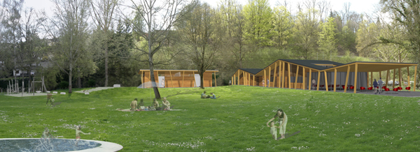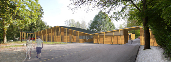 Die Gestaltung der Neubauten orientiert sich am Ort und ergänzt mit den schrägen Holzstützen die Parklandschaft der Baumstämme. Dadurch integrieren sich die Gebäude im Gesamtbild und lassen die eigentlichen Fassadenflächen in den Hintergrund treten.