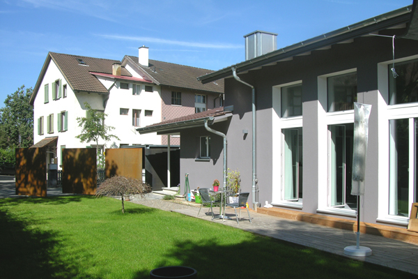 Das äussere Erscheinungsbild des Gebäudes wurde mit Ausnahme der neuen Fenstertüren zum südlichen Garten praktisch beibehalten. Lediglich ein Carport und bewegliche Sichtschutzelemente aus rostendem Stahl wurden dazugebaut.