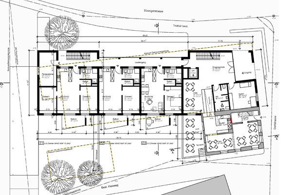 Der 2-geschossige Kopfbau dient als Hauptzugang der Anlage und wird über Eck erschlossen. Hier sind Eingangshalle mit Treppenanlage und Lift sowie allgemeine Räume platziert. Im Altbau enstand im Erdgeschoss ein Cafe und im Obergeschoss eine Wohnung. Im Längsbau wurden 10 Wohnungen mit 2.5-3.5 Zimmern untergebracht.