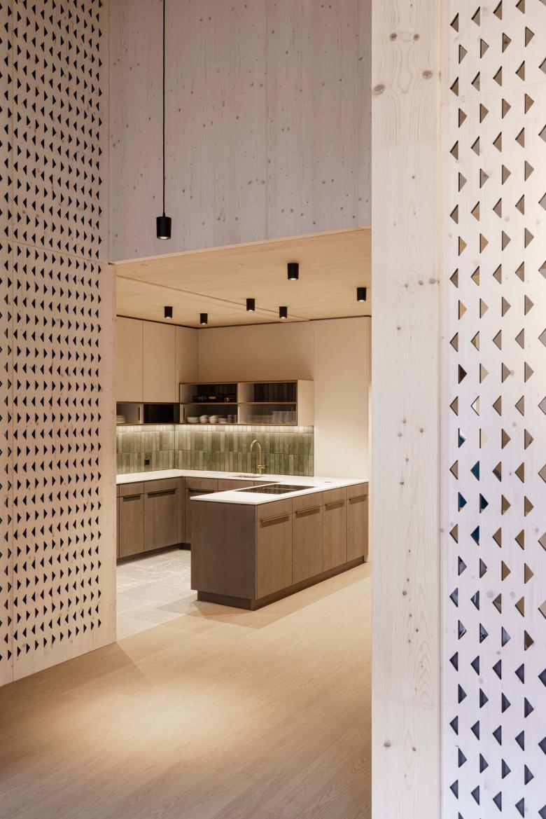 Das Projekt ist als hochwertiger Holzbau mit einem hohen Anteil an Wohnungen im gehobenen Segment konzipiert. Es fügt sich harmonisch in das verdichtete bauliche Umfeld ein und erfüllt zugleich höchste Ansprüche an Komfort und Ästhetik. Abstrahierte Sgraffito-Muster, die aussen Anwendung finden, schaffen eine Verbindung der lokalen Tradition und Moderne.