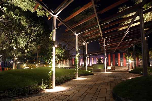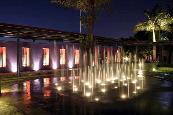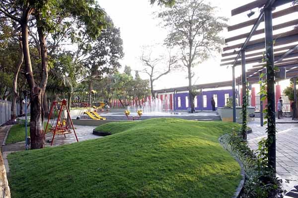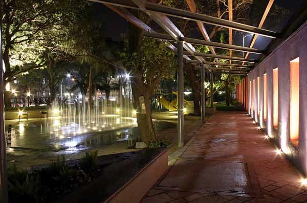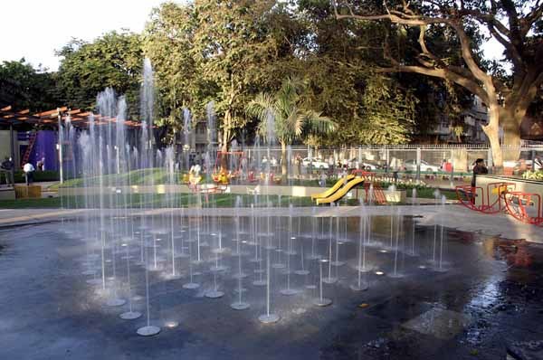 The park had two edges; one fronting the Maidan and the other fronting the city. Since they had to have varying qualities of transparency, they were treated differently. A brightly coloured semi solid wall fronted the grounds, while a see through fence formed the interface with the road. Wanting to give something beyond the regular, the park has two focus areas; one is of course the children’s play area and the other, a fountain sprouting out of a paved plaza as a value addition. Kids can play in these fountains, synchronized to music. The plaza can be used to walk on when the fountain is not in use. Ambient lighting plays an important role in focussing attention on the spaces, especially in the late evenings.