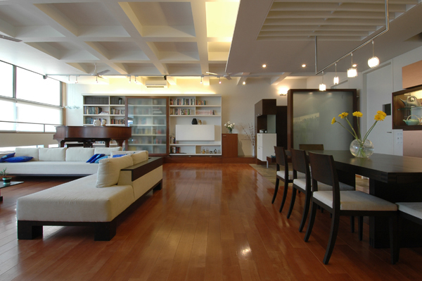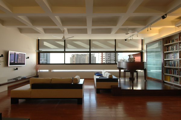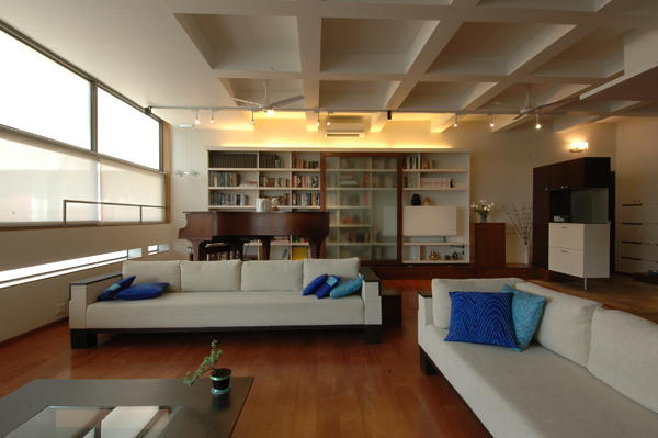 An apartment with a global soul- that is what the clients brief required. A large open hallway with a grid slab ceiling had to be modulated into four distinct zones to take care of the family needs. A raised teak wood platform that had a piano and a library formed one zone, a dining with a lowered ceiling height made the second, the third was meant for entertainment while the fourth was given to an entry vestibule. The project highlighted these four zones as distinct spaces forming the whole- but all flowing into each other visually and as space.