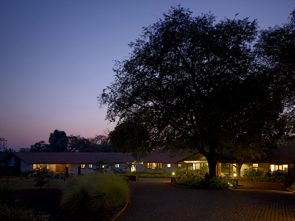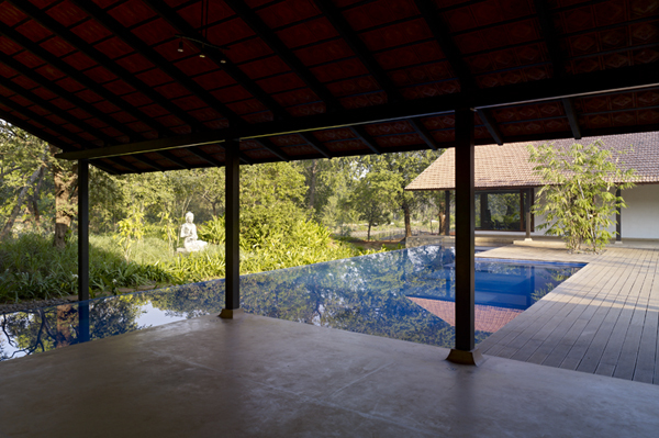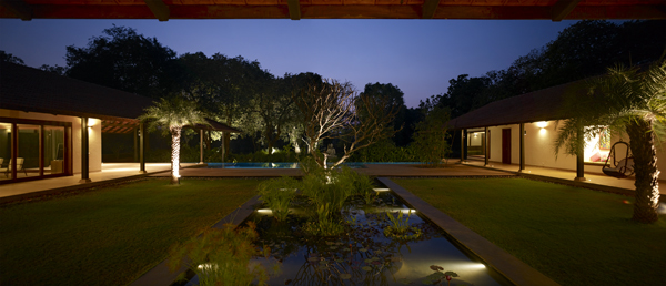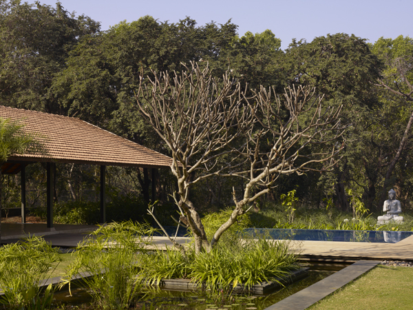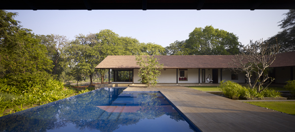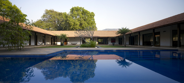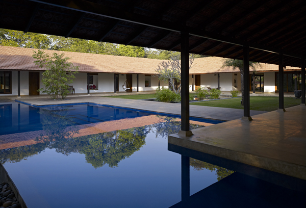 The house forms a ‘C’ shaped courtyard with a lap pool along its open end. The 7500 sft house has verandah and passages which become outdoor living areas in the humid Alibag climate. The house takes the vernacular idiom of the pitched roof courtyard house and aims to blend within the surrounding rural landscape with the use of red clay Mangalore and ceiling tiles- yet distinct in its proportions to create a contemporary space. A lotus pond with a frangipani tree is the entrance feature within the courtyard and helps gives scale to the space. The house uses traditional cement flooring to bind all the spaces. All rooms have courts to maintain privacy for the interior spaces. There is a separate spa structure that sits overlooking a pond- a feature incorporated to use the natural overflow of the monsoon stream.