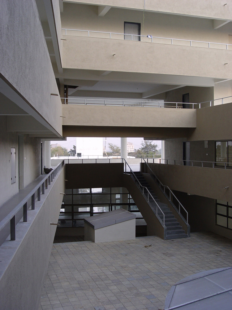 The highlight of this project is the complex handling of program and translating that into a meaningful architecture. The program had a Language School and Girls Hostel combined into a small plot of 20,000 sft. The project has two distinct functional needs, yet is able to accommodate each with ease on a very tight urban plot. To create the sense of an “urban campus” within a tight urban situation was the real challenge and to create a sense of “belonging to the ground” for the hostels even though they are located above a institute is the strength of the project. The project explores the idea of creating a campus like feel in a tight urban plot thru the use of public atrium/ podium spaces. These are reflected in the institute part as covered spaces while the hostel section makes use of open terraces to re-create the ground plane at an elevated level. The project has abstracted the program into the generative units of the 3 person shared hostel room and the 30 seater classroom. The program is layered in section with the hostel rooms sitting on top while the classrooms are below. A Service Floor separates the two programs. The project has successfully separated the two circulations of the two diverse programs to make both of them work well within one building.