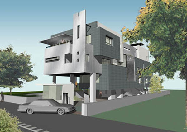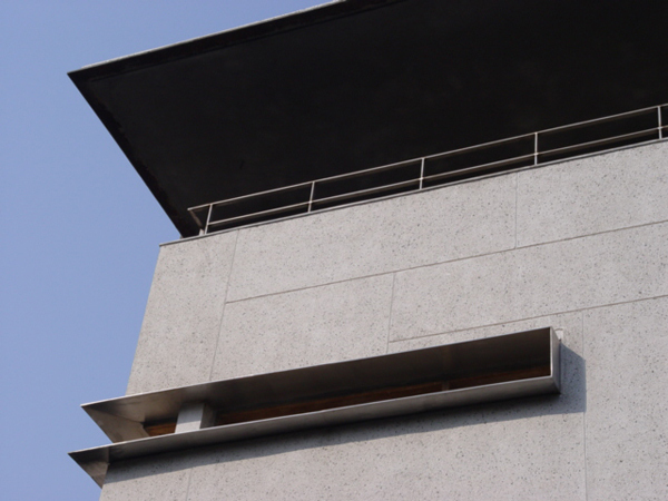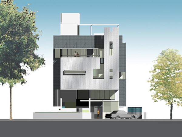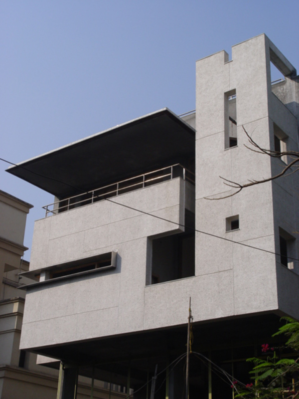 A single family dwelling on a 6000 sft plot in prime residential area of Juhu. Many bungalows in the area get torn down to build highrises. Our client still desired to build a bungalow. The design evolved to make an introvert looking three storey dwelling with a designed terrace space for entertainment. The house is zoned such that the formal and guest areas are on the first floor, the main family room and important zones like Kitchen and Dining are on the second floor. The first two floors are connected by a double height courtyard space. The third floor accommodates the private personal spaces - Master Bedroom and two Children rooms. These come together in a double height courtyard that encompasses the terrace spaces within it. The house is about light and ventilation with ample skylights to take in light and large opening on the south and west sides for the predominant winds. The front facade has wooden screens, cantilevered balconies, stainless steel weather protection boxes. The house uses a white cement based marble aggregate plaster that is cast with the help of special craftsmen from Gujarat.