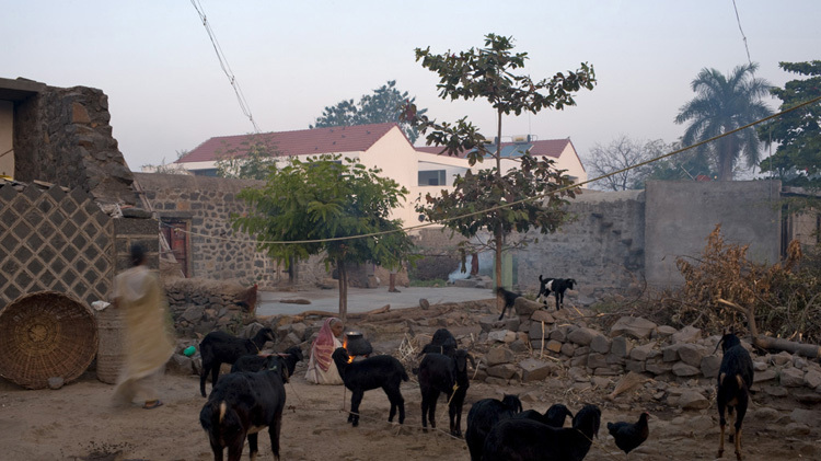 A village house set within interior Maharashtra for a head of an entire village (Sarpanch). The house had to accommodate a large joint family and had nine bedrooms, two living spaces, family spaces, large kitchen, a dining space, a prayer room, a home theatre and a public hearing space. This large program was housed around a central courtyard. The site also accommodated ten cows and buffaloes along with staff quarters. The local black stone of the Deccan was used as a feature throughput the house by making walls in one direction with this material. This material moved in and out of the house, defining interior and exterior spaces. The house uses solar heating, rain water harvesting while the kitchen is served by gobar gas.