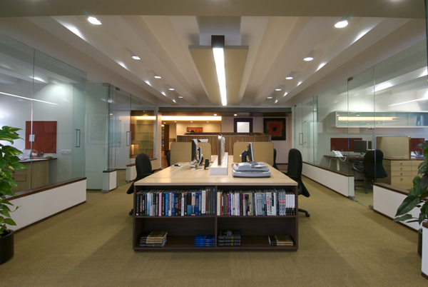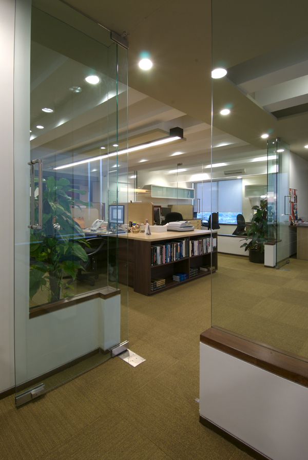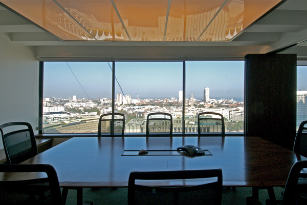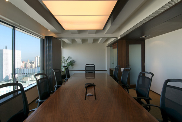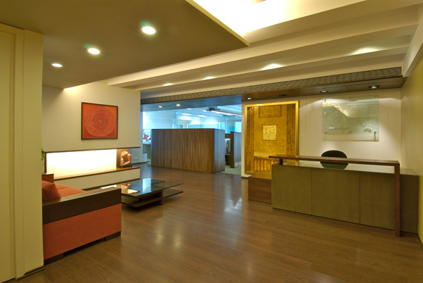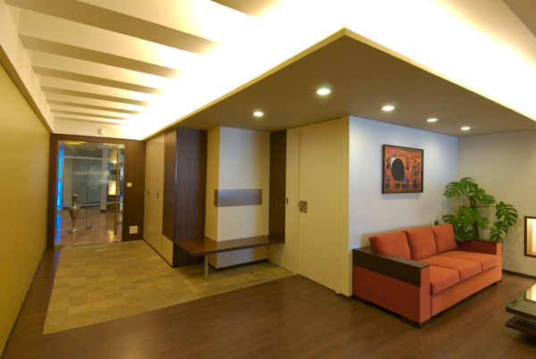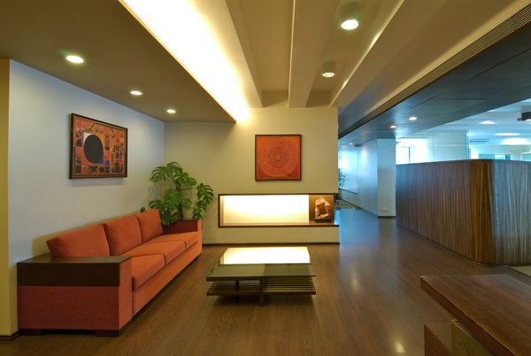 An office on the 21st floor in downtown Mumbai for a Chicago headquartered executive head hunting firm having spectacular views of the sea and the Mumbai skyline. The ceilings were low with ribbed slabs and these were exposed to create an illusion of more height and give the space a graphic quality. An all woman office, the entry/ reception area had to be warm to keep executives at ease and the choice of materials, colours were very intentional to give a bit of a homely feel.
