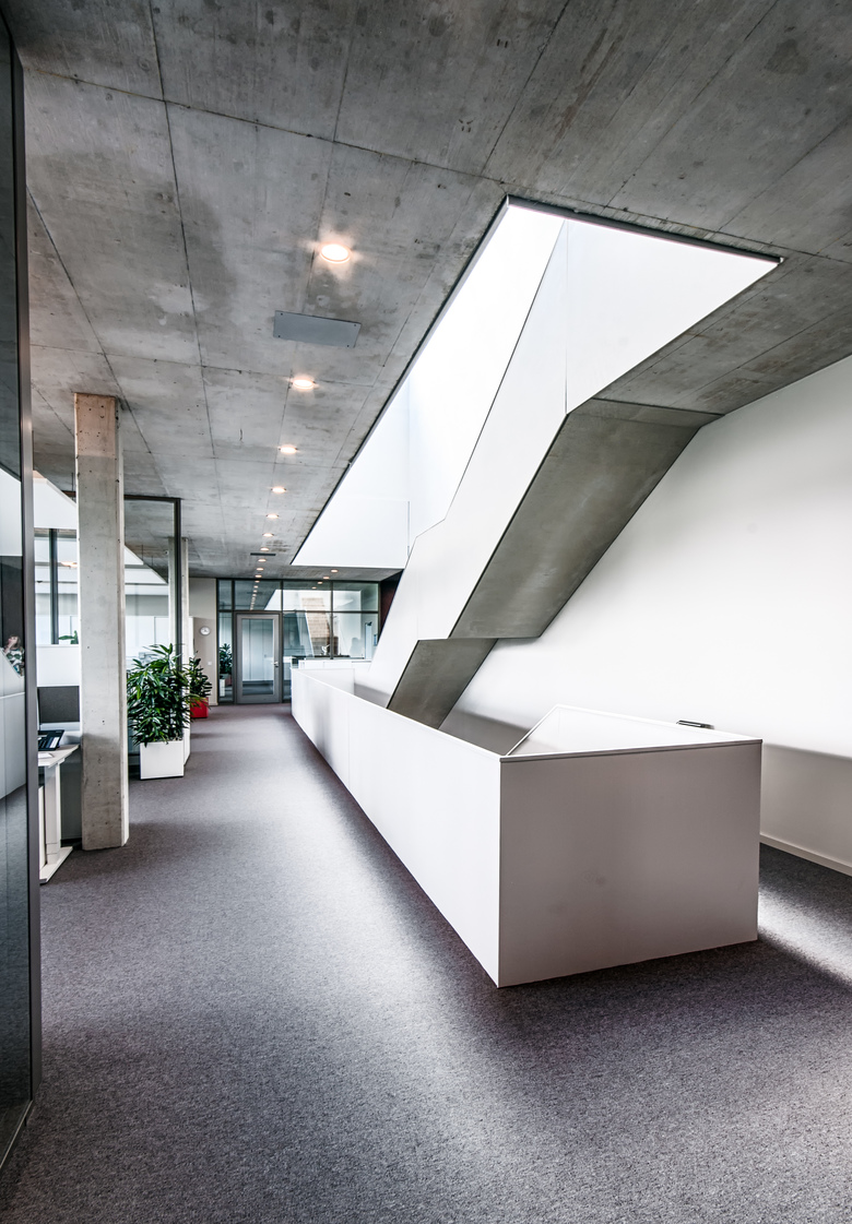 Verwaltungsgebäude mit Kundenbereich und Logistikhalle in Augsburg. Die einfache aber prägnante Entwurfsidee zeigt selbsterklärend das Geschäftsfeld des Unternehmens. Die sachliche Gestaltung der transparenten Innenräume entspricht der funktional geprägten Geschäftsidee des Unternehmens.