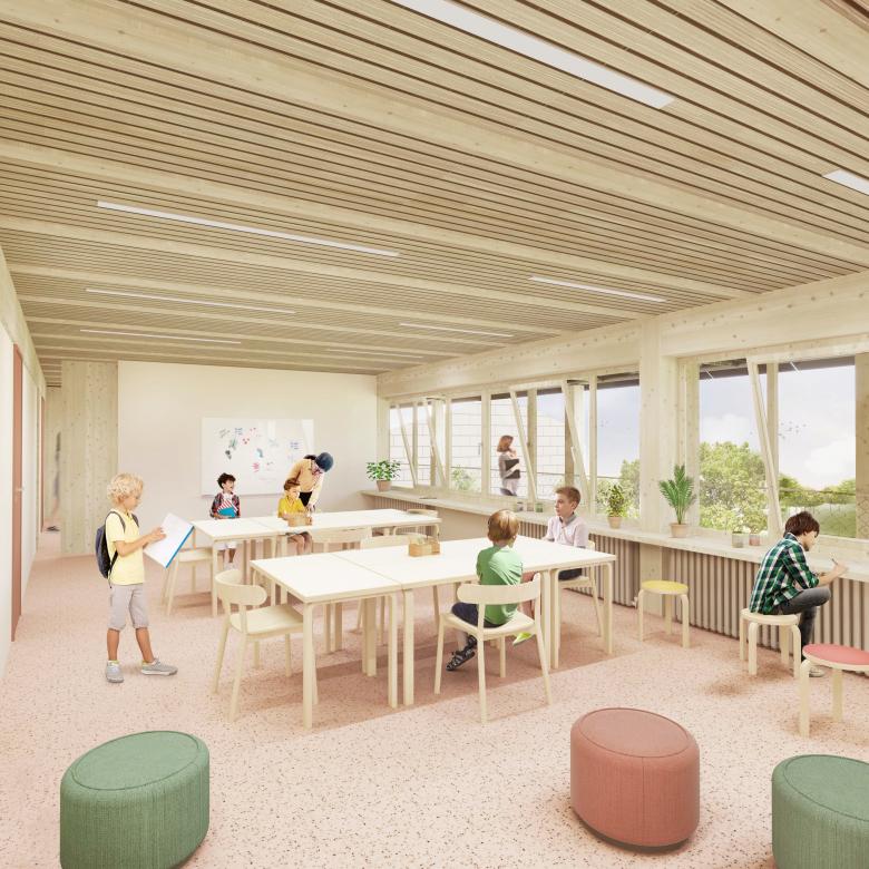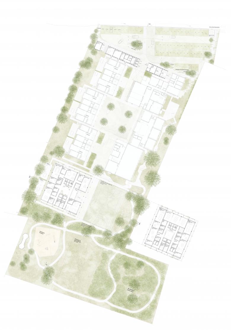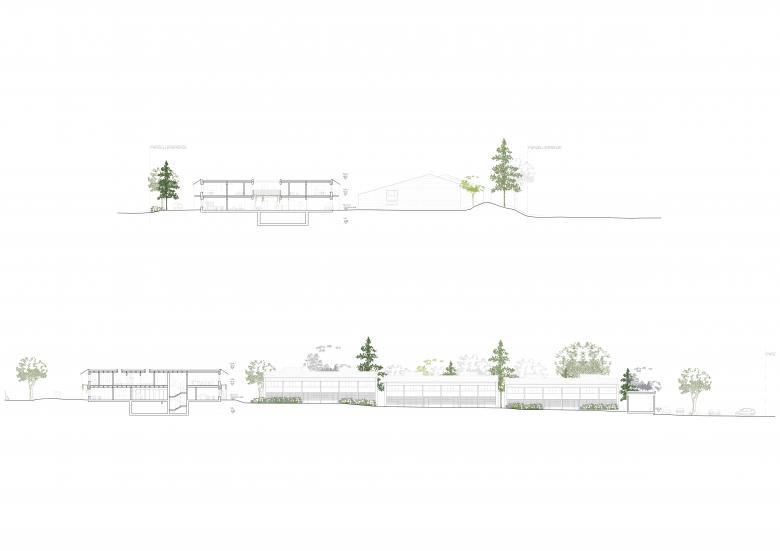 Das fehlende Puzzlestück. Unser Vorschlag für das neue Hauptgebäude der Schule ist eine Interpretation der bestehenden Architektursprache der Anlage: das Rot als ikonische Farbe, der Säulenrhythmus der Arkaden, die ähnlichen Proportionen, der ähnliche Massstab. Ein nachhaltiges Gebäude, das von einer Holzkonstruktion getragen und von Photovoltaik-Paneelen umrahmt wird, ist unsere zeitgenössische Variante.
