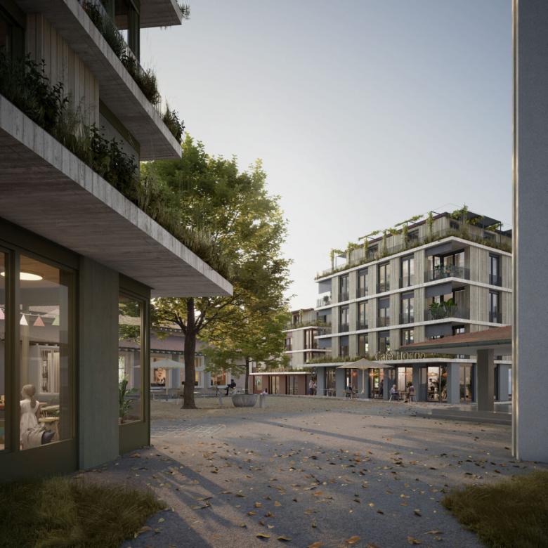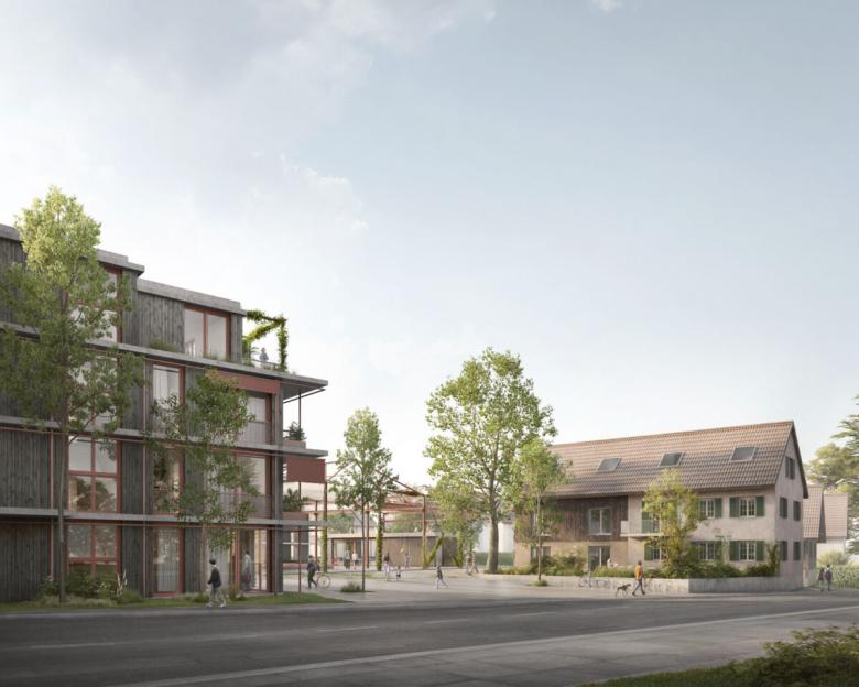 Der Charakter eines hybriden Gebäudeensembles aus unterschiedlichen Volumen mit jeweils identitätsstarker Typologie wird durch das Hinzufügen von vier zusätzlichen Gebäuden erweitert. Vier klare, einfache Baukörper ergänzen das Ensemble und versammeln sich um den zentralen Platz als Zentrum des Gemeindelebens. Zwischen den Körpern öffnen sich die Räume in die offene Umgebung und vernetzen die Mitte mit dem Quartier.