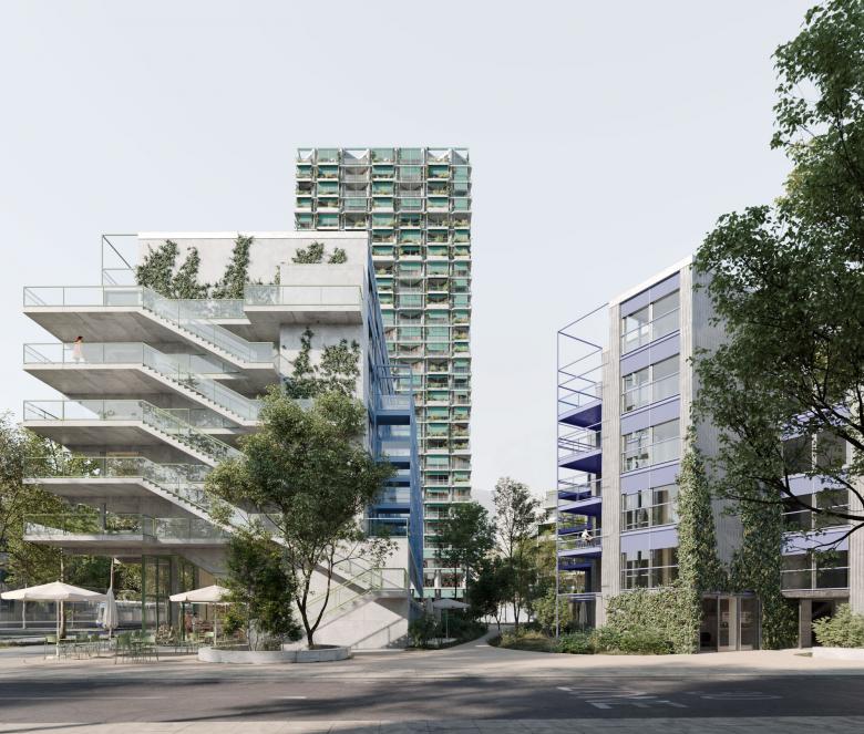 Das Projekt der ARGE Penzel Valier und ROBERTNEUN™ verbindet bestehende Strukturen mit neuen Grossformen in Dietikon. Ein 80-Meter-Wohnturm setzt einen markanten Akzent, während das diagonal gegenüberliegende Quartierhaus mit gestaffelter Höhenentwicklung den Stadtraum präzise ergänzt. Zwei Zeilenbauten entlang der Strassen fassen den Raum und schaffen städtebauliche Nischen mit fliessenden Übergängen zum öffentlichen Bereich. Der zentrale Garten bildet das Herz des Quartiers.