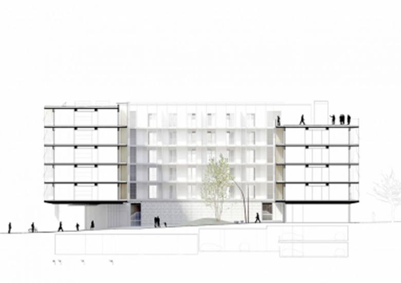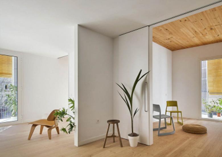 85 dwellings, 543 spaces and 2172 corners For the 10,000 m2 of built surface area of the new building in Cornellà de Llobregat (Barcelona), consisting of 85 social housing units laid out on five levels, a total of 8,300 m2 of zero kilometre timber from the Basque Country has been used. The bases of this new residential building are a matrix of communicating rooms that eliminates corridors to guarantee optimum use of the floor plan and the use of timber to enable the industrialization of elements, improved quality of construction and a major reduction of deadlines and C02 emissions. The building is organized around a courtyard that articulates a sequence of intermediate spaces. On the ground floor, a porch opens up to the city, anticipating the doorway of the building and filtering the relationship between public space and the courtyard that acts as a small plaza for the community. The four vertical communication shafts are situated at the four corners of the courtyard so that all the occupants converge and meet in the plaza, which represents a safe space from a gender perspective. On the model floor, entry to the apartments is from the communication shaft and the private terraces that make up the ring of outdoor spaces that overlook the courtyard. The building’s general floor plan is a matrix of communicating rooms. There are 114 spaces per floor, all of similar dimensions, eliminating both private and community corridors to make the maximum use of the floor space. The server spaces are laid out in the central ring, while the rest of the rooms, of undifferentiated use and size (13 m2), in the façade, accommodate different forms of occupation. The surface area and proportion allow generous corners as a support that facilitates the appropriation of space. The structure is mainly determined by setting 3,60m short spans, matching the matrix of rooms. Therefore, multiple supports uphold CLT slabs: cross-laminated timber bearing walls in the façade and a system of laminated timber columns and beams in the centred bays. The structure is optimised by compensating momentums with multiple supports and cantilevers at all ends. In order to achieve economic feasibility in social housing, timber volume needed by built squared metre is been optimised down to 0,24m3/m2 The façade’s construction system and the structure joints are both solved by mechanical bonds, avoiding the use of scaffolds. The exterior building skin is built up with electro welded wire mesh, holding/bearing sun shading and filtering sights. By bending, this element improve steadiness and at the same time it shapes the terrace’s handrail.