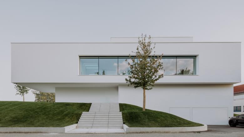 Dabei ist der Ort an dem die Villa Fröschle entstand sicher kein Standort, der das Prädikat Triple A verdient hat. Das bedeutet nicht, dass das Grundstück keine reizvollen Attribute besitzt; jedoch waren diese durch einen unmittelbar im Süden angrenzenden Gewerbebetrieb und die zweiseitig umlaufende Straße massiv beeinträchtigt. Gemeistert hat Anna Philipp diese Herausforderung in dem Sie das Gebäude wie auf einem grünen Hügel am höchsten Punkt im Gelände platziert hat. Als zweite wesentliche Maßnahme hat sie die Lebensräume vom Erd- bzw. Gartengeschoss in das erste Obergeschoss verlegt.