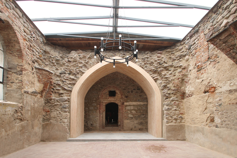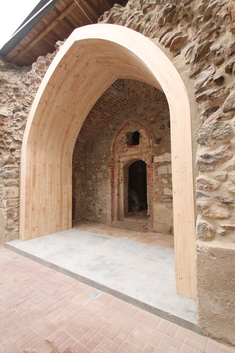Die zur Sicherung des Jochbogens gewählte, obere Konstruktion aus Leimholzbindern ist über eine verdeckte Schwelle mit dem Fundament verbunden; die einzelnen Bindersegmente sind miteinander gekoppelt, so dass die Bogenkonstruktion wie eine große, in die Öffnung hereingestellte massive Zarge wirkt. Durch Vermörtelung der Fuge mit Kalkmörtel wurde der Kraftschluß zur Unterstützung des Feldsteinbogens hergestellt.