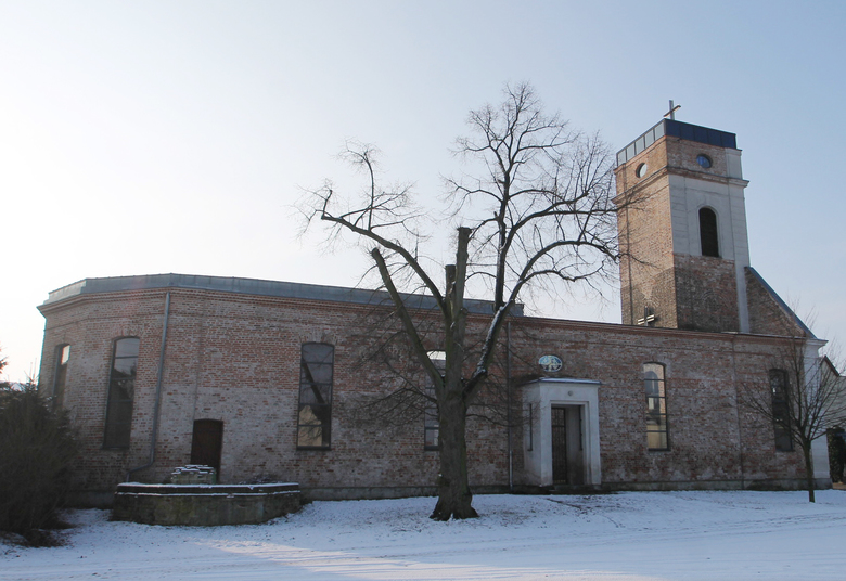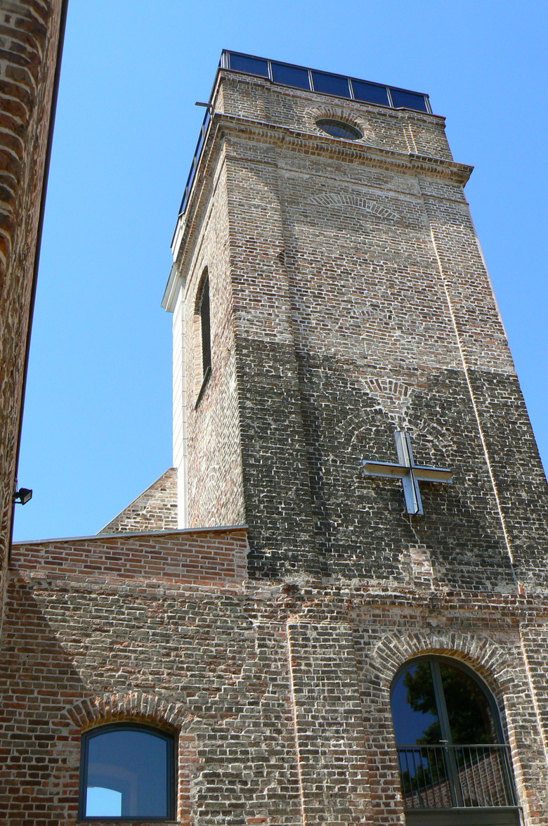 Der Turm der Kirche wurde als massiver, verputzter Ziegelbau erbaut. Seit 1945 standen hiervon nur noch die Umfassungswände, alle Deckenebenen und Verdachungen waren, ebenso wie der oberste Teil des Turmmauerwerks zerstört.