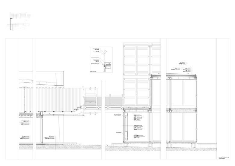 Since the climatic exigence asked for impermeability and insulation, numerous specific details had to be developed to maintain the stringent appearance of the containers. The elaborate details, for example the still visible steel beams of the containers in the interior, stand in contrast to the rather rough and crude tectonic details of the freight container. Further, the modular system was challenged by the individual joints, resulting from the irregular distribution of the containers.