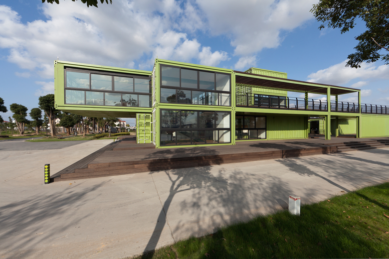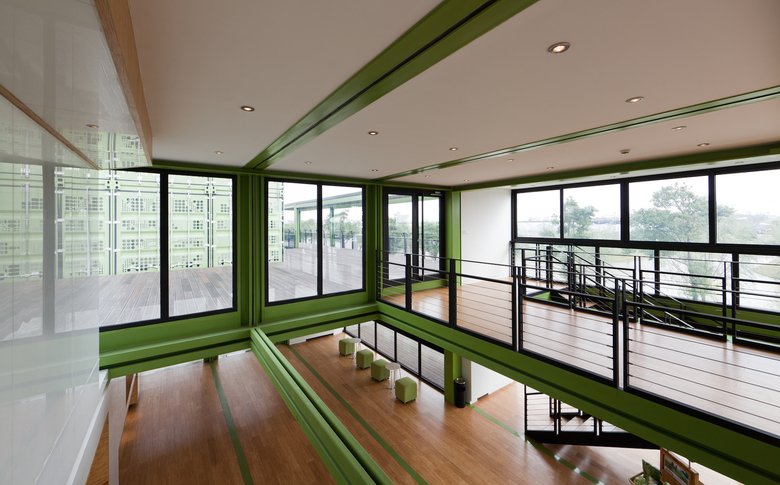 Another ambition of the project is to reduce the energy hidden in construction materials, the so called grey energy. Therefore recycled, ecologically sustainable, fast growing or at least recyclable materials have been used. The re-use of freight containers seemed adequate, first for its inherent structural autarky and second for being a common metaphor for „recycled space“. Further, the minimal weight of the container structure allowed to re-use the existing foundation plate. The use of local bamboo products for indoor and outdoor flooring, as well as all the built-in furniture additionally supports the ambition of constructing a truly sustainable building.