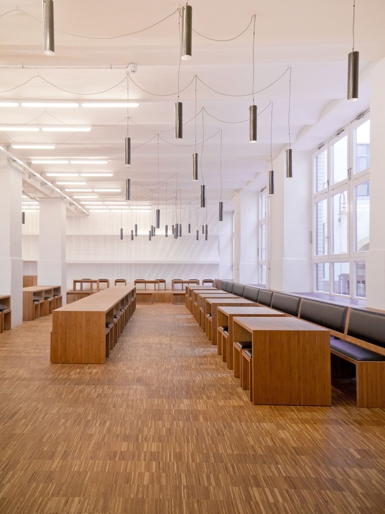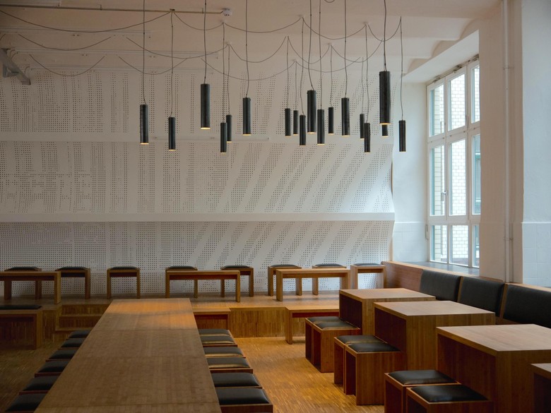 Raststätte is a restaurant project, initiated and operated by the VIA Werkstätten group in the southern Berlin bourough of Tempelhof. The restaurant consists of a large open seating area, café and kitchen with support spaces for handling staff training and catering. Elements of the existing space such as the brick vaulting and its historical identity (the birthplace of the vacuum-tube post) inspire layout and material use throughout.