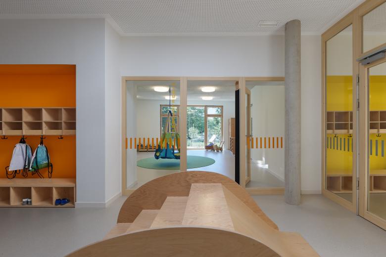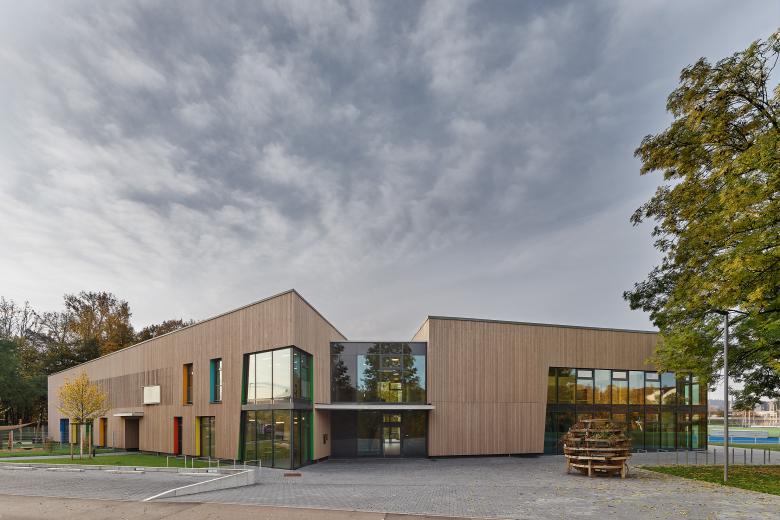 In der Stadt Schorndorf entstand ein neues Gebäudetrio in einer bundesweit einzigartigen Kombination: sechsgruppiger Bewegungskindergarten, Mehrzweckgebäude und optional eine Kletter- und Boulderhalle. Die drei unterschiedlich genutzten Bausteine sind auf einem Grundstück miteinander in Einklang gebracht und gleichzeitig sowohl in den Sportpark Rems als auch in die umgebende, landschaftlich reizvolle Auenlandschaft mit Rems und Wieslauf sensibel eingebunden.