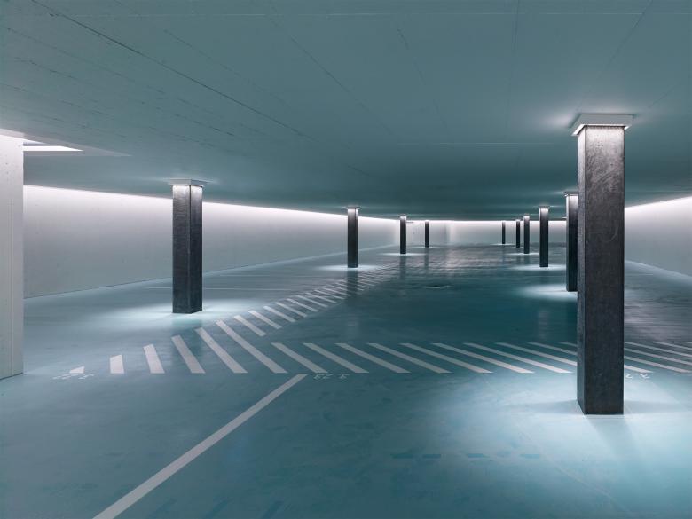 Die Haupterschliessung des Neubaus erfolgt über das ebenerdige Eingangsgeschoss, welches den Empfang, die nötigen Dienstleistungsflächen und Räume beinhaltet. Über den zentralen Erschliessungskern werden die drei Obergeschosse mit den Reha-Klinik-Zimmern erschlossen. Zudem ist über diesen Kern die dreigeschossige Autoeinstellhalle verbunden. Ein weiterer zusätzlicher Erschliessungskern verbindet den Neubau mit den Rehabilitations-Räumen im Zwischenbau.
