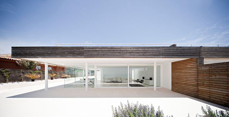 We built horizontal spaces that, set low to the earth, almost disappear. We place was limited with low white walls on which the volume settles, melding with the site.