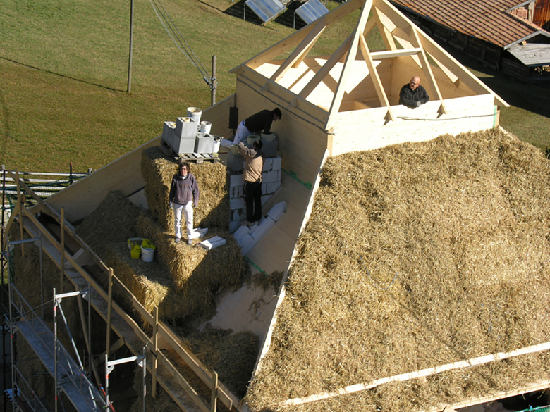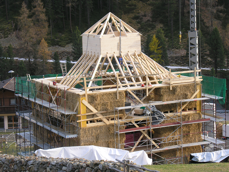 Am Anfang stand der Wunsch des Ehepaars Esser Ferienwohnungen zu bauen, möglichst naturnah und Im Langtaufers-Tal im Südtirol, auf 1850m Höhe, liegt der Biobauernhof von Richard Fliri. Hier wünschte sich der freischaffende Künstler auf dem ihm noch zur Verfügung stehenden Bauplatz von ca. 100 qm einen Neubau für Ferienwohnungen und sein Atelier. Das Gebäude sollte ökologisch und nachhaltig wer-den - ein Haus aus Stroh.