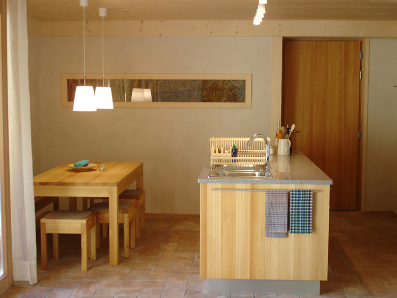 Nachdem sich die Strohwände gesetzt haben, werden im Inneren die Trennwände mit Ziegeln aufgemauert und anschliessend alle Wände mit Lehm verputzt. Die Lehmwände sowie die mit Terracotta gedeckten Böden bilden die thermische Speichermasse, die für eine angenehme Klimatisierung sorgt.