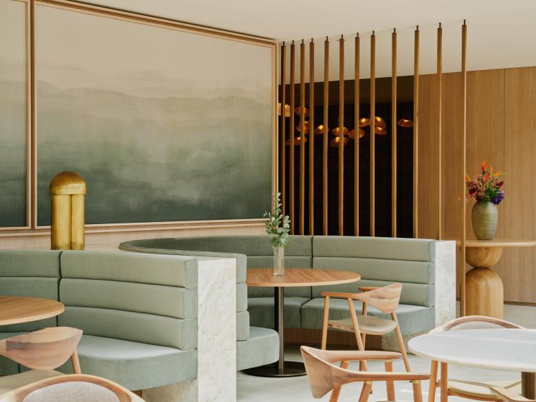Jeder Bereich ist bis ins Detail mit einem individuellen Farb- und Materialkonzept abgestimmt. Dabei setzt HENN auf handwerkliche Details: Im Eingangsbereich erinnern Travertin-Natursteinplatten an den Wänden an Sanddünen. An der Decke schweben Pendelleuchten aus unregelmäßig mundgeblasenem Glas wie rundgeschliffenes Meerglas und sorgen für eine subtile Asymmetrie mit einem interessanten Schattenspiel. Zwischen den Sitznischen platziert, wirken die Messing-Tischleuchten wie Skulpturen. Die Teppiche im Eingangsbereich und der Lounge sind handgeknüpft, der geschwungene 16 Meter lange Teppich im mittleren Speisesaal wurde speziell für diesen Raum angefertigt. Die Akustik-Wandpaneele sind in individuell bedrucktes Textil gehüllt, die aus Original-Aquarellen von HENN entstanden sind.