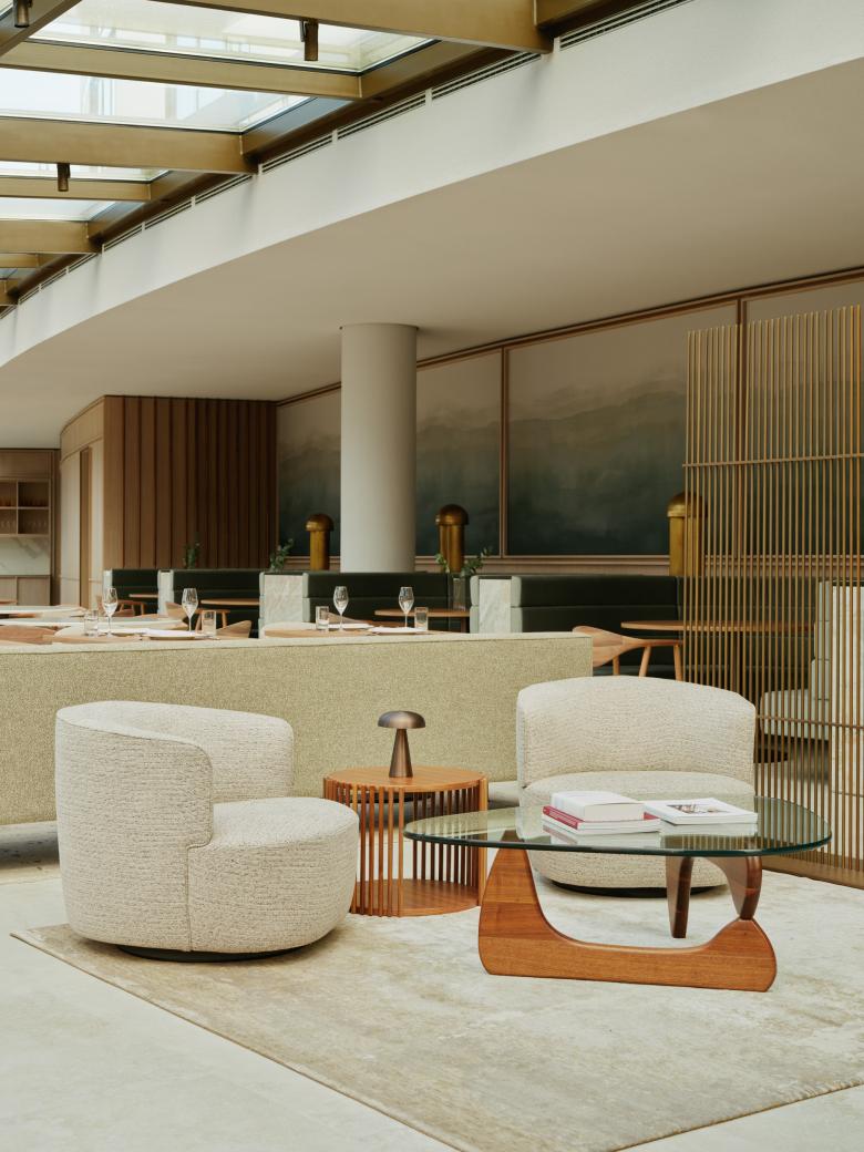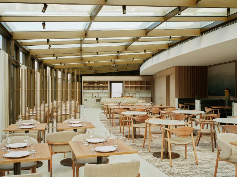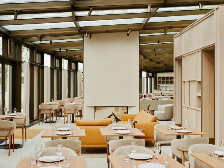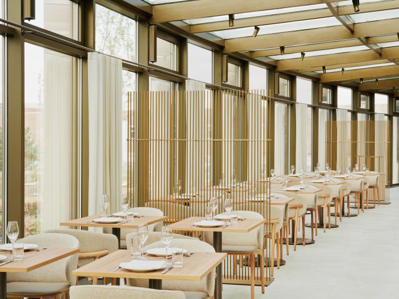 Vom Ufer des Mittellandkanals in der Autostadt Wolfsburg bietet das AURA Restaurant des 5-Sterne-Hotels Ritz-Carlton einen eindrucksvollen Blick auf das denkmalgeschützte VW-Kraftwerk. Im Kontrast zur industriellen Umgebung hat HENN das Interieur, inspiriert von einer Küstenlandschaft, mit hellen, warmen Farben und natürlichen Materialien gestaltet.
