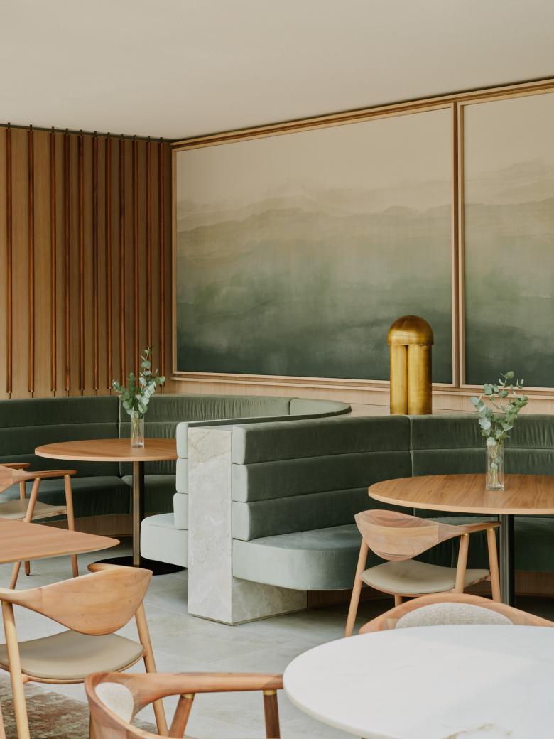 Mit Farben, Formen und Texturen führt der Raum wie durch eine maritime Landschaft von einer Sanddüne zum mit Kieselsteinen bedeckten Meeresufer. Eine ruhige Lounge ist durch einen freistehenden Kamin wie ein Separee abgetrennt. Im zentralen Speisesaal nehmen Gäste an den freistehenden Tischen Platz. Mehr Privatsphäre bieten vier Sitznischen an der Innenwand im rückwärtigen Bereich. Drei mit hellem Naturstein verkleidete Buffetinseln an der Stirnseite des Raums definieren die dritte Zone und erinnern in ihrer ovalen, organischen Form an Steine, die von den Wellen glatt geschliffen wurden.
