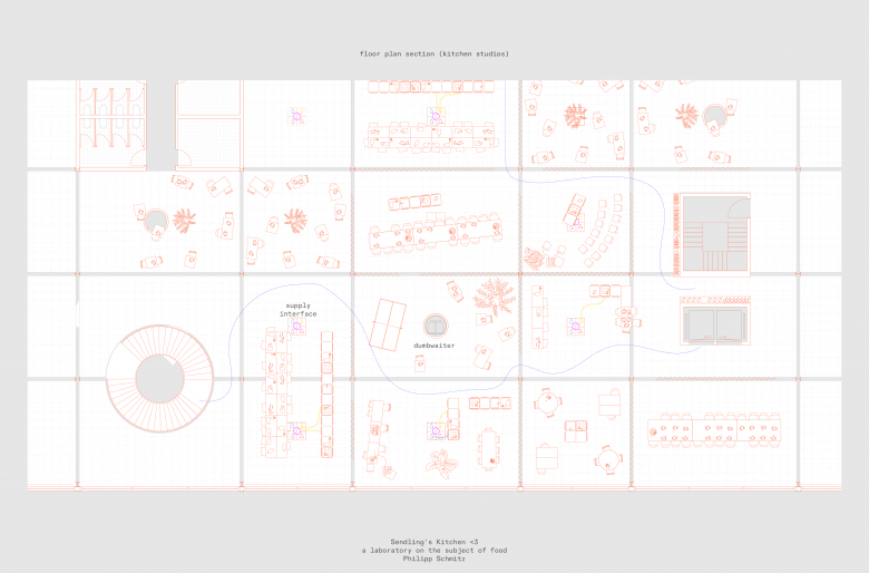 The technical infrastructure is created by a technical level that is 'inserted' between the two public floors and supplies them centrally. Food can be transported upwards from the market using dumbwaiters. In the centre of each unit, which is marked by four supports, there is a supply interface. Any medium such as water, electricity or gas can be controlled directly from here and brought to the desired position. The resulting space does not dictate any configuration and is directly shaped and characterised by the various users and their behaviour. The result is a space that allows new processes to be tested in an experimental environment.