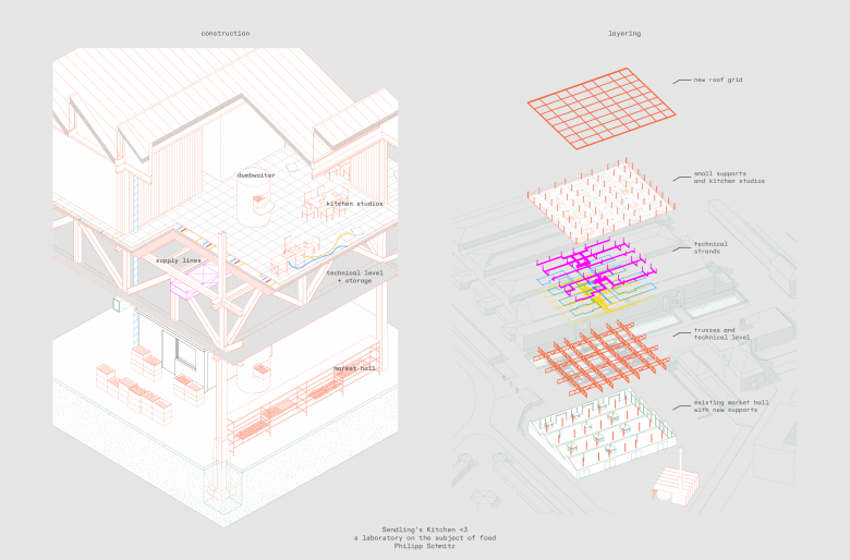 Sendling's Kitchen develops a new typology. It combines the wholesale market with cooking, teaching and exhibition uses. It creates an experimental space for research, community and learning through infrastructure, construction and circular processes in the food industry.