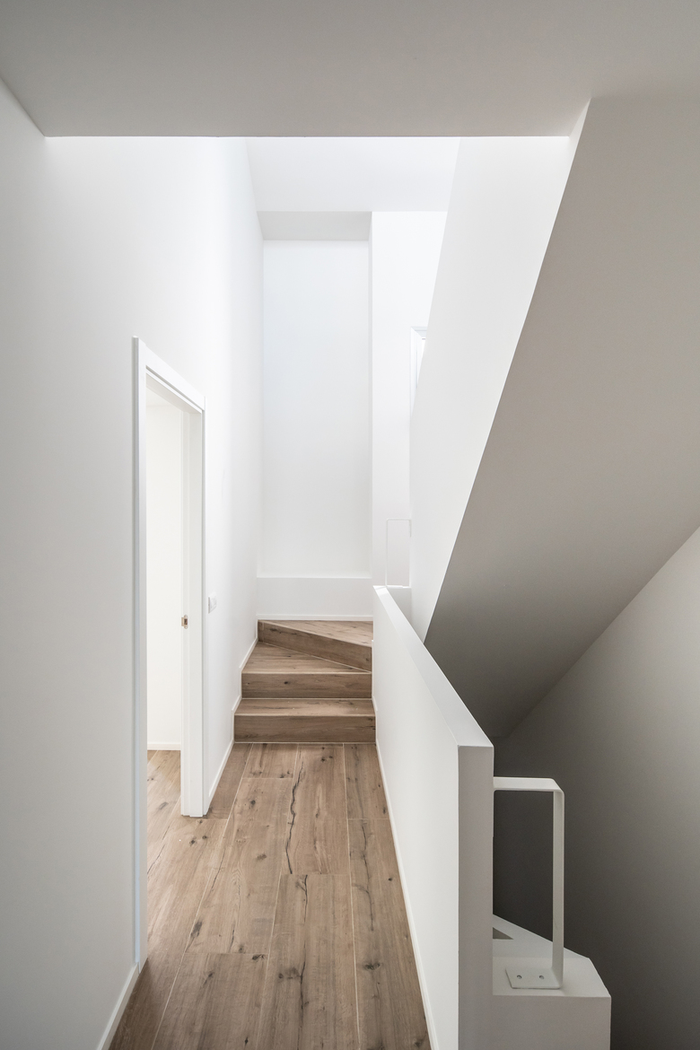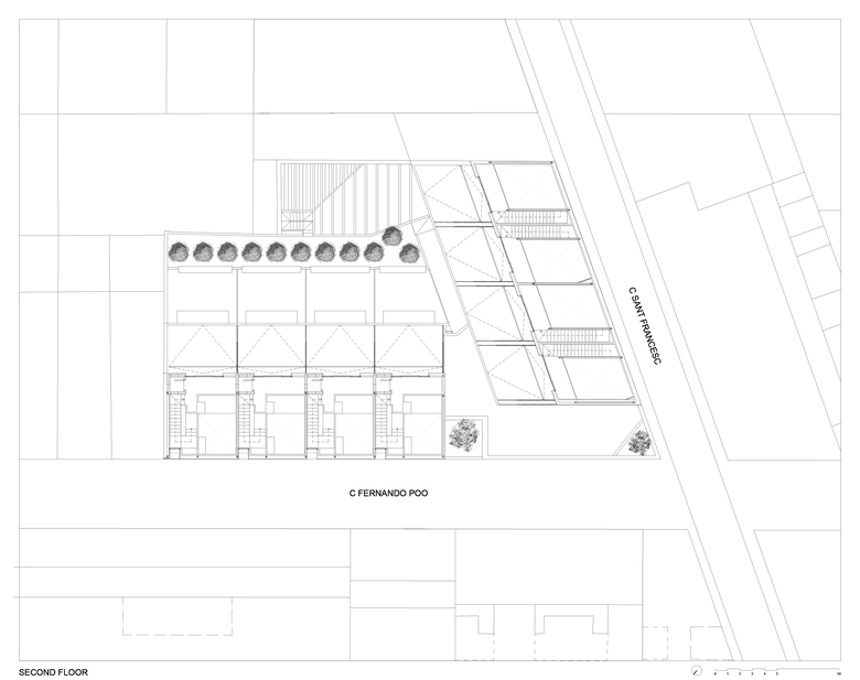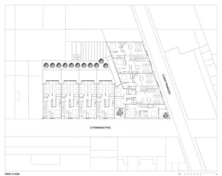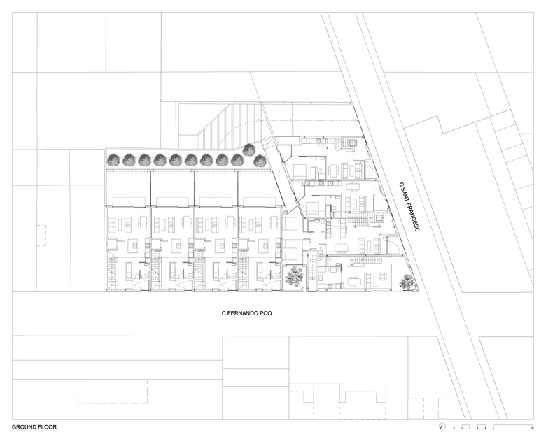 In Calle San Francesc the typological solution insists on the animation of the ground floors as a founding element of the social control of the city. A simple system of entrances avoids elevators and extends the street towards the interior of the houses and communal spaces. The collective constructs the city and organizes through-dwellings on the ground floor and duplex dwellings on the first. The corner is resolved with a T-shaped dwelling that opens onto the inner courtyard and an empty space that proposes a fresh interruption on Calle Fernando Poo. The effect of the corner is thus of benefit to three houses and provides an access space that is colonizable by the inhabitants.
