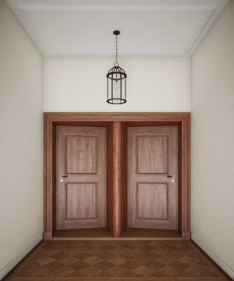 Schon zur Bauzeit des "Haus zum Kiel" war es aus ökonomischer Not üblich, Geschosse von Stadtwohn- häusern in kleinere Einheiten von wenigen Zimmern aufzuteilen. Die Längshalle wird in der Achse des Treppenhauses halbiert. Folglich entstehen zwei gleich- wertige Zugänge zu den gräumigen Wohnungen. Das bestehende, bescheidene Portal - gebildet aus dem Futter, der Zierverkleidung und der Schwelle - wird auf die Podestbreite ergänzt. Die Türen sitzen zurückversetzt in der Leibung, kompensieren die knappe Podestdimension und sind in Gehrichtung leicht abgedreht - eine würdige Adresse der Wohnungen. Dadurch verändert sich das Wesen des Treppenhauses nur marginal.