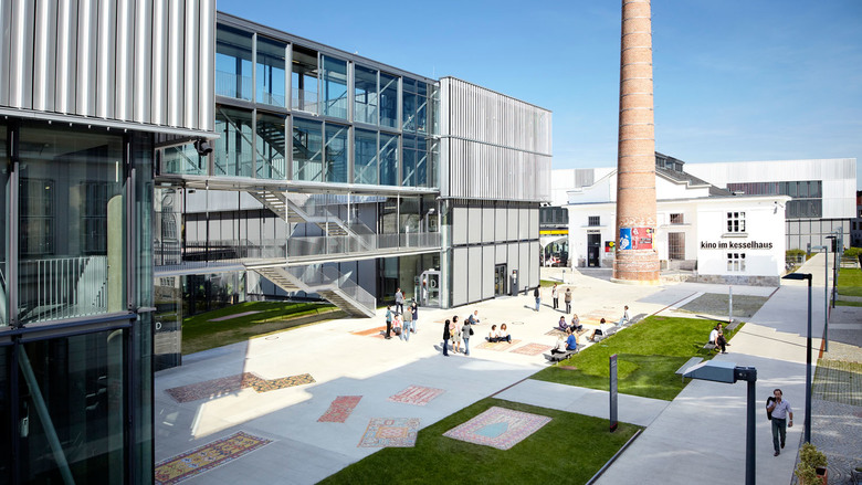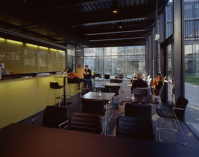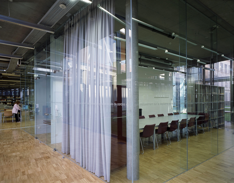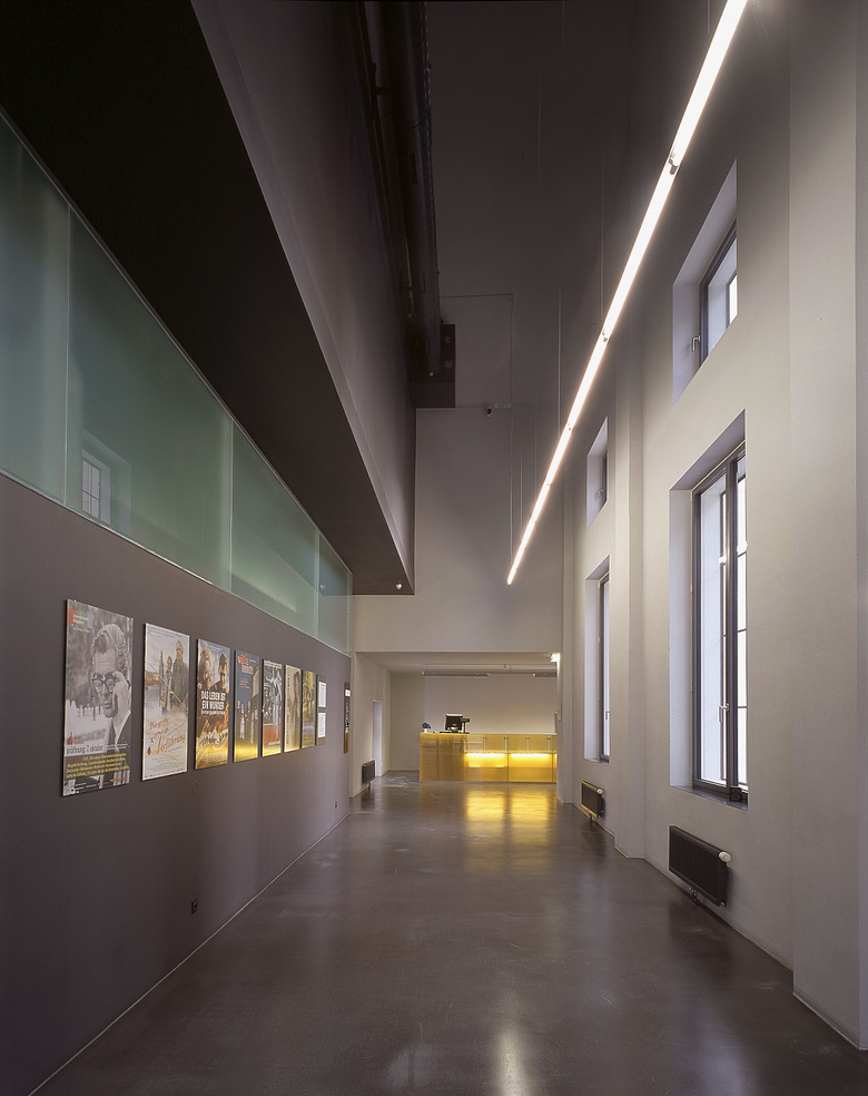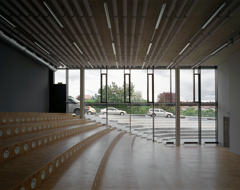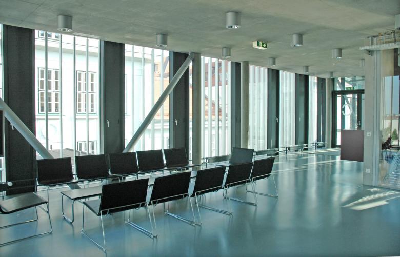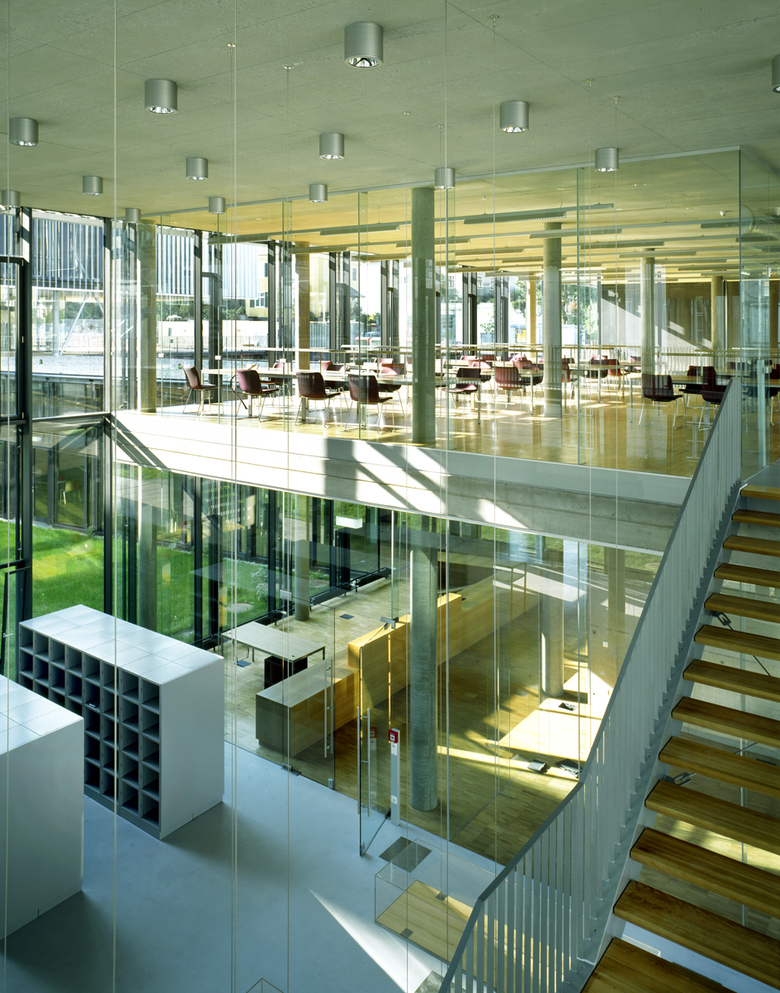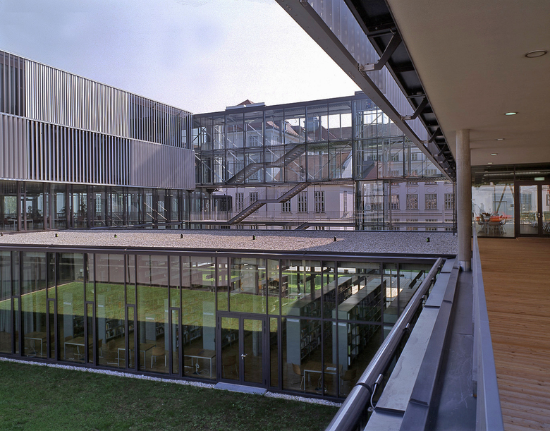 In a comb-like structure, three four-storey blocks oriented east–west extend an existing three-winged building dating from 1922. These contain university amenities, such as a library, a refectory, several seminar rooms, specialist laboratories and offices. To the west, an irregularly shaped auditorium closes the compound. To the east, an old boiler house with a characteristic brick chimney holds a cinema and bar connected via a subterranean exhibition space to a smaller four-storey cube, the Centre for Film. Across a small stream, a five-storey block for the University of Applied Sciences obliquely faces the other buildings, formally linked to the campus through the common facade system. From the outside, the individually adjustable louvres shimmer when turned to different angles. Their perforation ensures that the view out is never completely blocked but instead only filtered, as is the light that falls on to exposed concrete ceilings and walls, open installations and mostly grey floors. Concrete, steel and glass combined with rectangular forms and simple plans give the complex a technical, clean and light appearance inside and out. Thus, the buildings profit from the contrast with the nearby vineyards and detached villas.