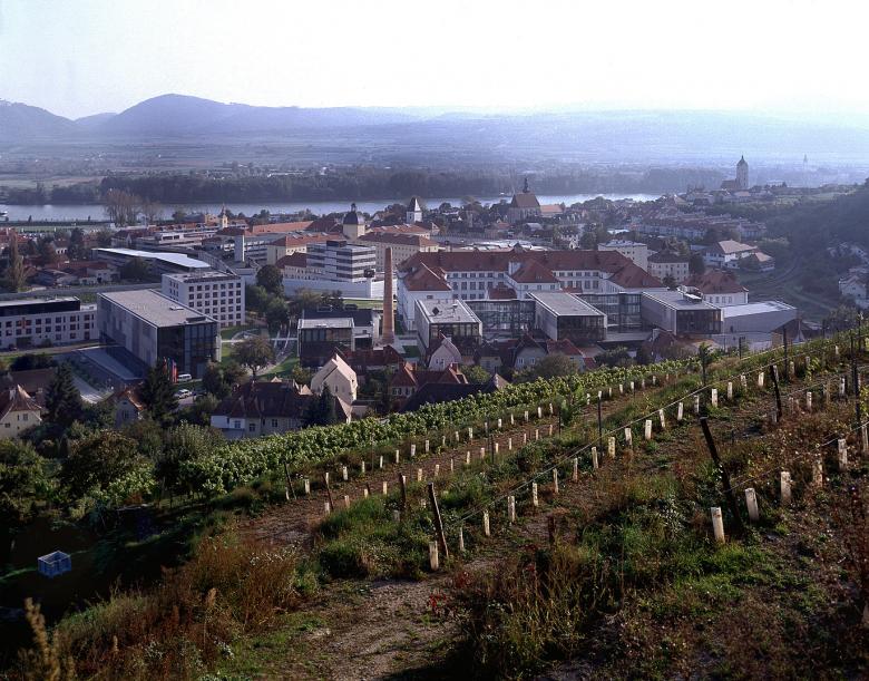 The new buildings for the University Campus Krems are situated on the edge of the rolling vineyards of the Wachau region, north of Wien. The buildings house the postgraduate Danube University, the University of Applied Sciences and the Centre for Film. All new buildings are visually linked by a coherent facade system of vertical, perforated aluminium louvres for the upper floors, and full-height glazing for ground and first floors.