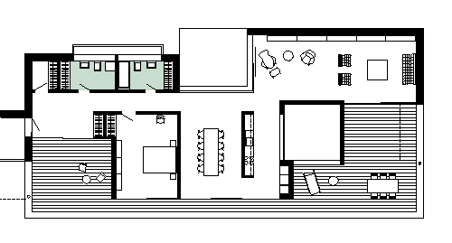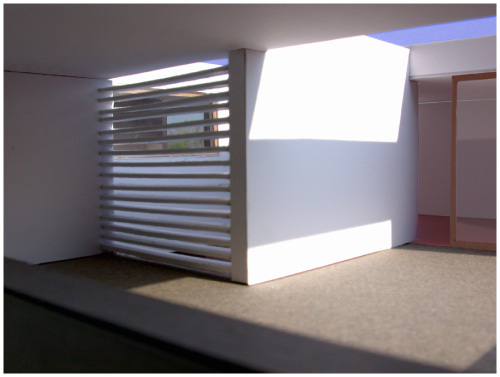 Die spezifische Anordnung von Hof und Terrassen schafft es trotz Zweigeschossigkeit, Einsichtsprobleme zu vermeiden.