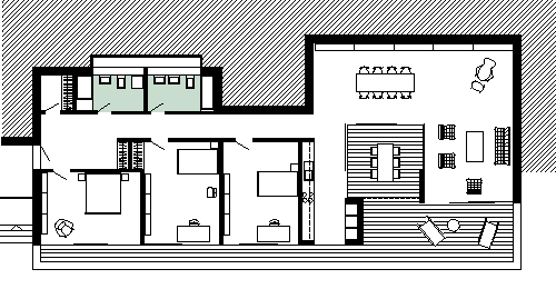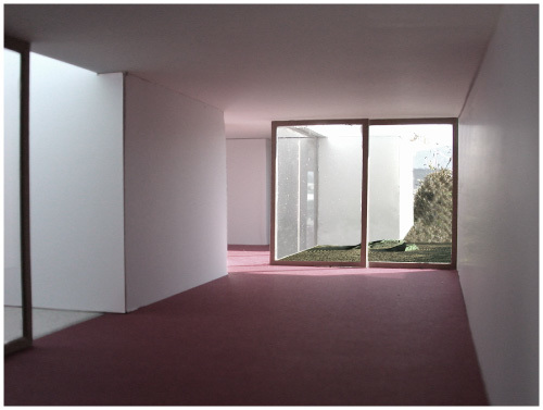 Die Wohnungen des Mehrfamilienhauses sind bestimmt durch den zentralen, zweigeschossigen Hof im Wohnteil. Dieser bringt Licht in die Tiefe der im Erdreich eingebetteten Räume und gliedert die Bereiche Wohnen, Essen, Kochen.